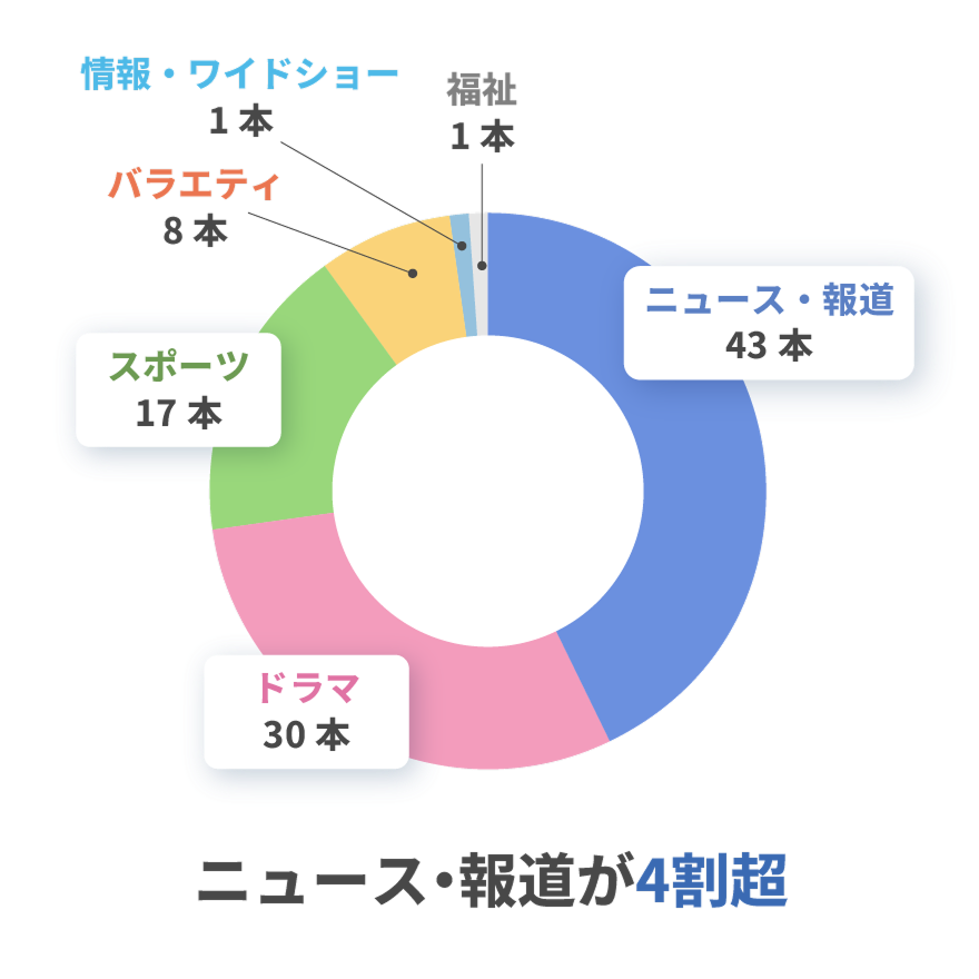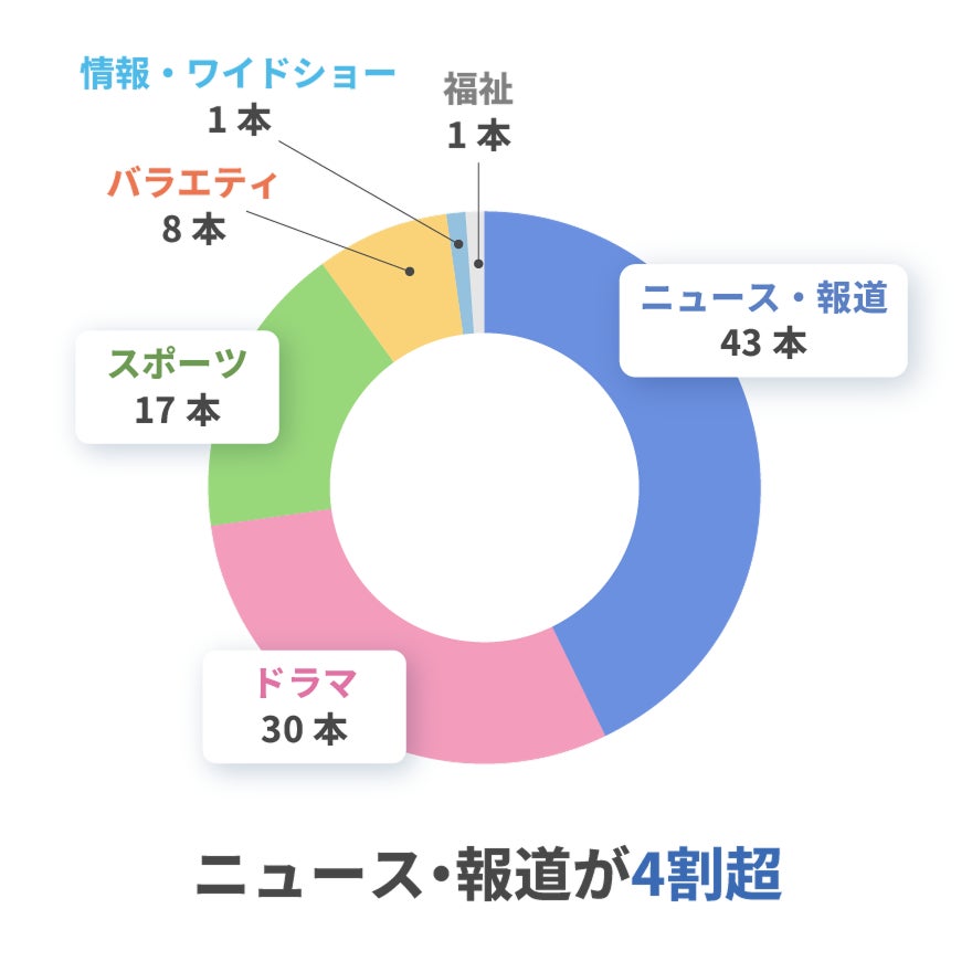番組別の視聴データTOP100をカテゴリ別に集計したところ、ニュース・報道番組が43本と全体の4割超を占め、ドラマが30本、スポーツが17本と続きました。バラエティが8本、情報・ワイドショーが1本、福祉番組が1本という結果で、ニュース・報道とドラマ・スポーツの3カテゴリだけで全体の9割近くを占めています。