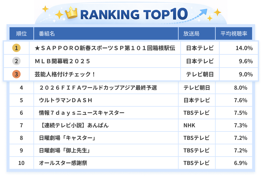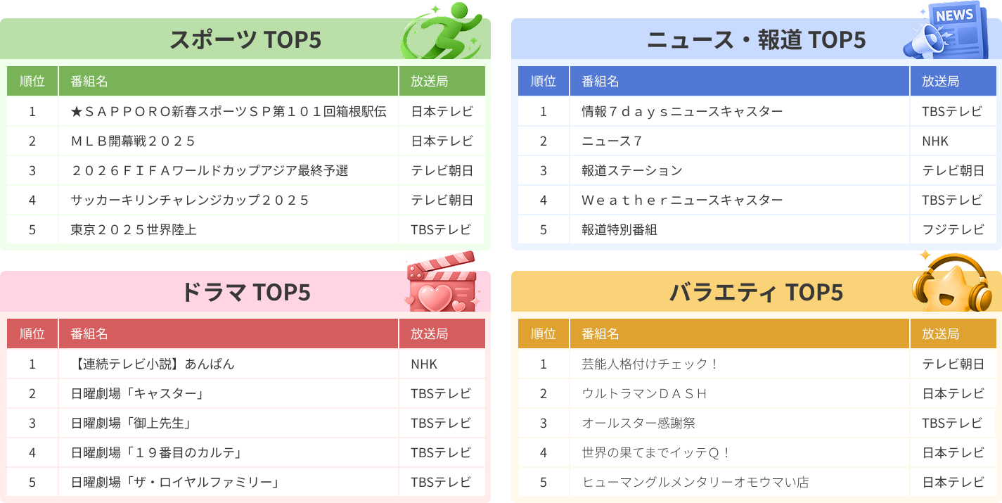シリーズ別ランキングをカテゴリ別に見ると、スポーツは「箱根駅伝」や「MLB開幕戦2025」、ニュース・報道は「情報7daysニュースキャスター」や「ニュース7」、ドラマは「日曜劇場」や「連続テレビ小説」、バラエティは「芸能人格付けチェック!」「ウルトラマンDASH」「オールスター感謝祭」など、各ジャンルの定番番組が上位を占めました。