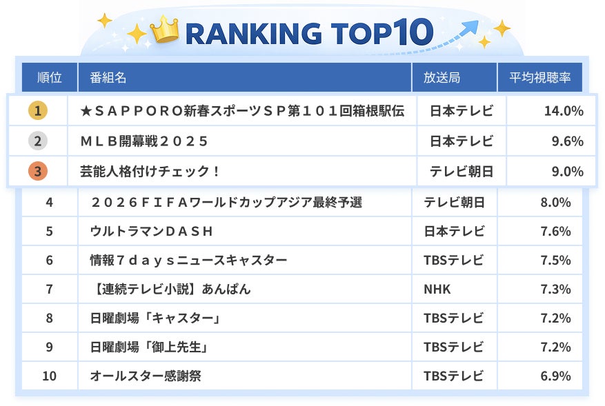 箱根駅伝やMLB開幕戦、FIFAワールドカップアジア最終予選、世界陸上などのライブスポーツに加え、夜のニュース・報道番組、正月特番や日曜劇場シリーズ、連続テレビ小説などの長期ドラマが上位に並び、「ライブスポーツ」「夜のニュース」「長期ドラマ・正月特番」が2025年のテレビ視聴を特徴づける結果となりました。