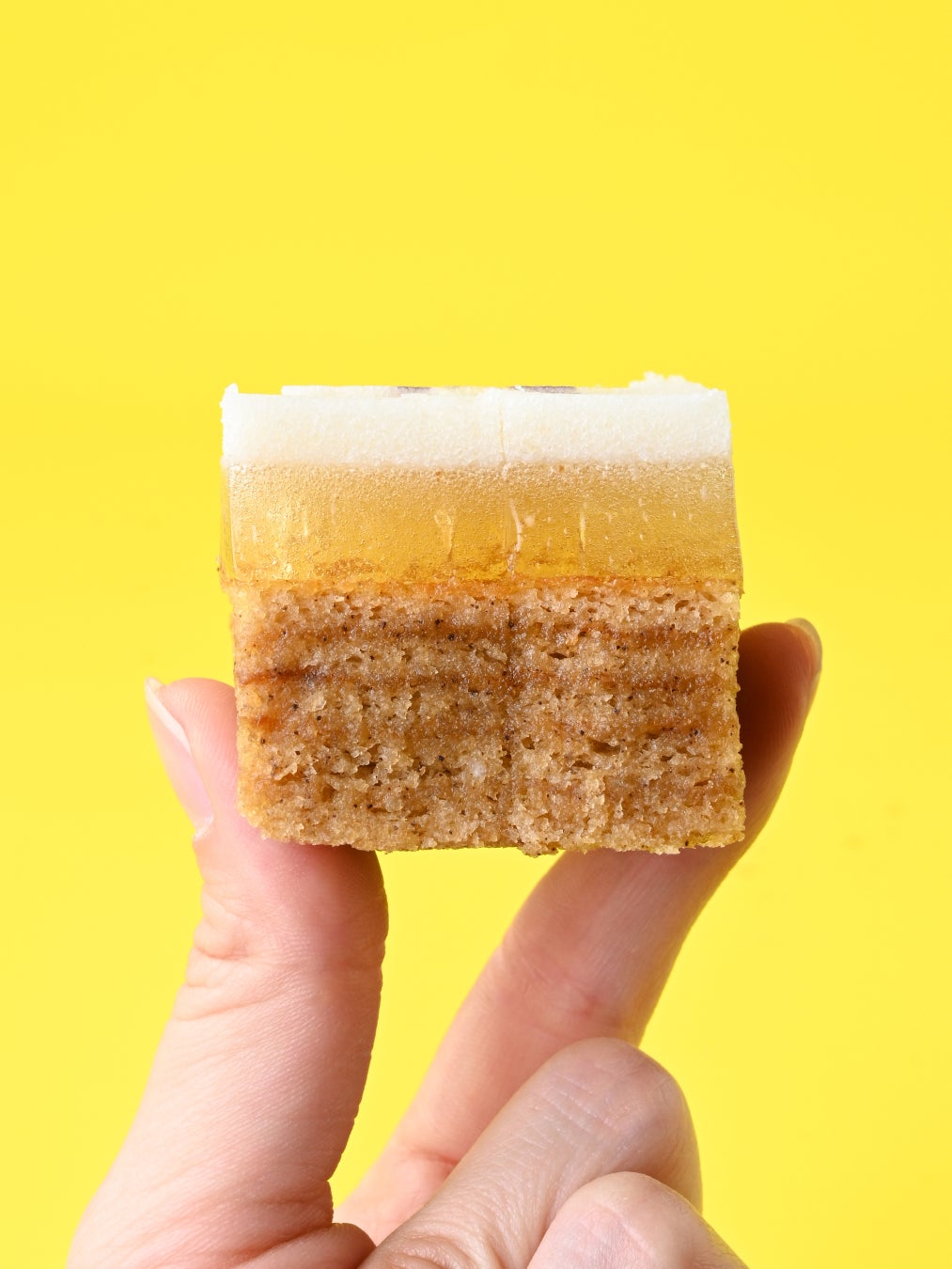 見た目にも楽しい、3層仕立ての“ゼリーバウム”。しっとりと焼き上げた紅茶味のバウムクーヘンに、ぷるんと涼やかなレモンゼリーを重ね、さらにふんわり軽やかな白い生地をあわせました。