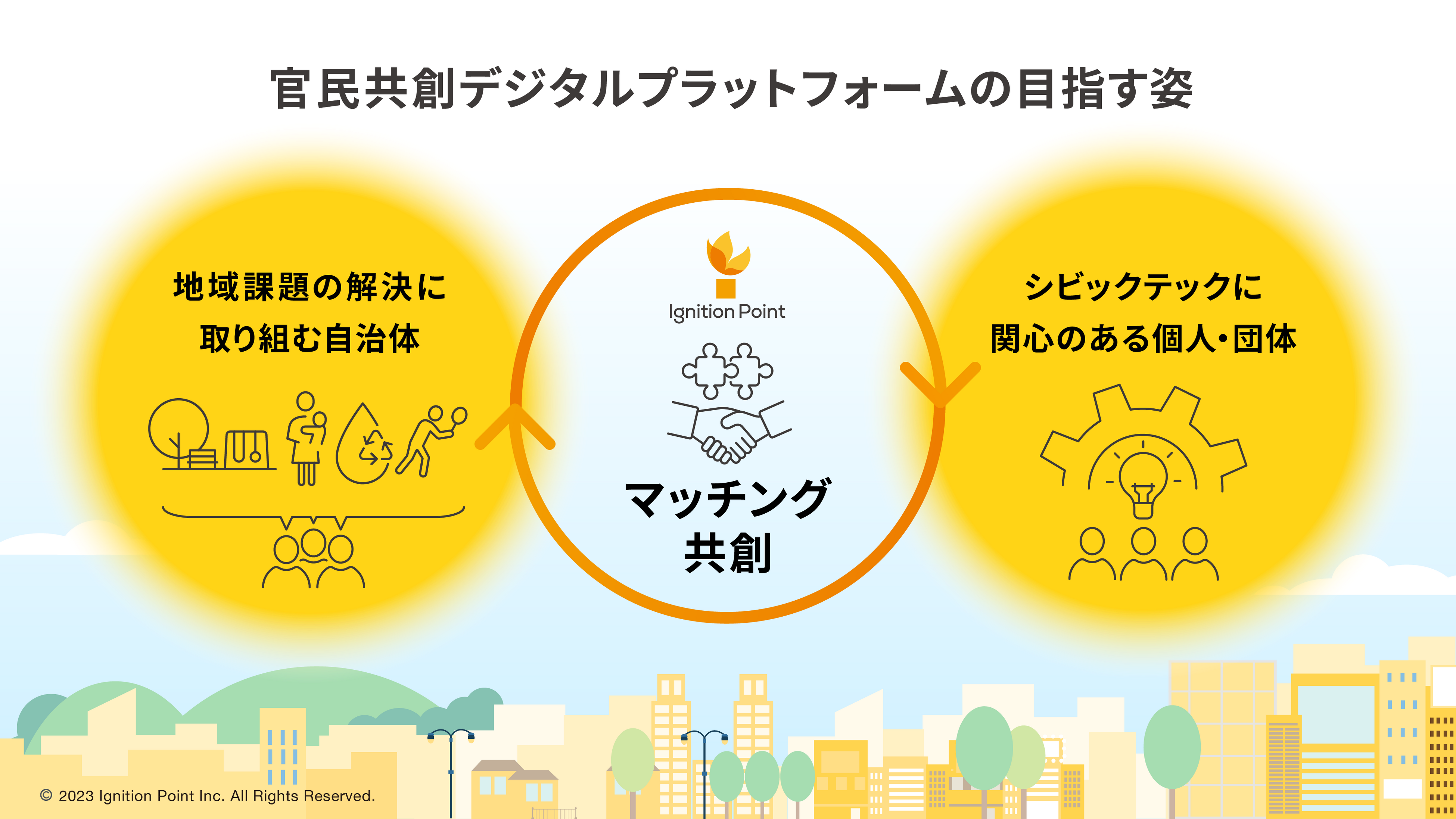 イグニション・ポイントは、2023年8月よりシビックテックに関心のある個人や団体に地域課題を幅広く知り、官民共創デジタルプラットフォームへのスムーズな登録、および自治体とのマッチングができるように顧客体験(UX)改善や大幅なデザイン改修を支援してきました。本業務においては、自治体やシビックテックに対してプラットフォームの利用啓発を目的とした働きかけや、シビックテックと地域課題をマッチングして解決策を創出するイベントを開催することで、共創機運の醸成を図ります。
