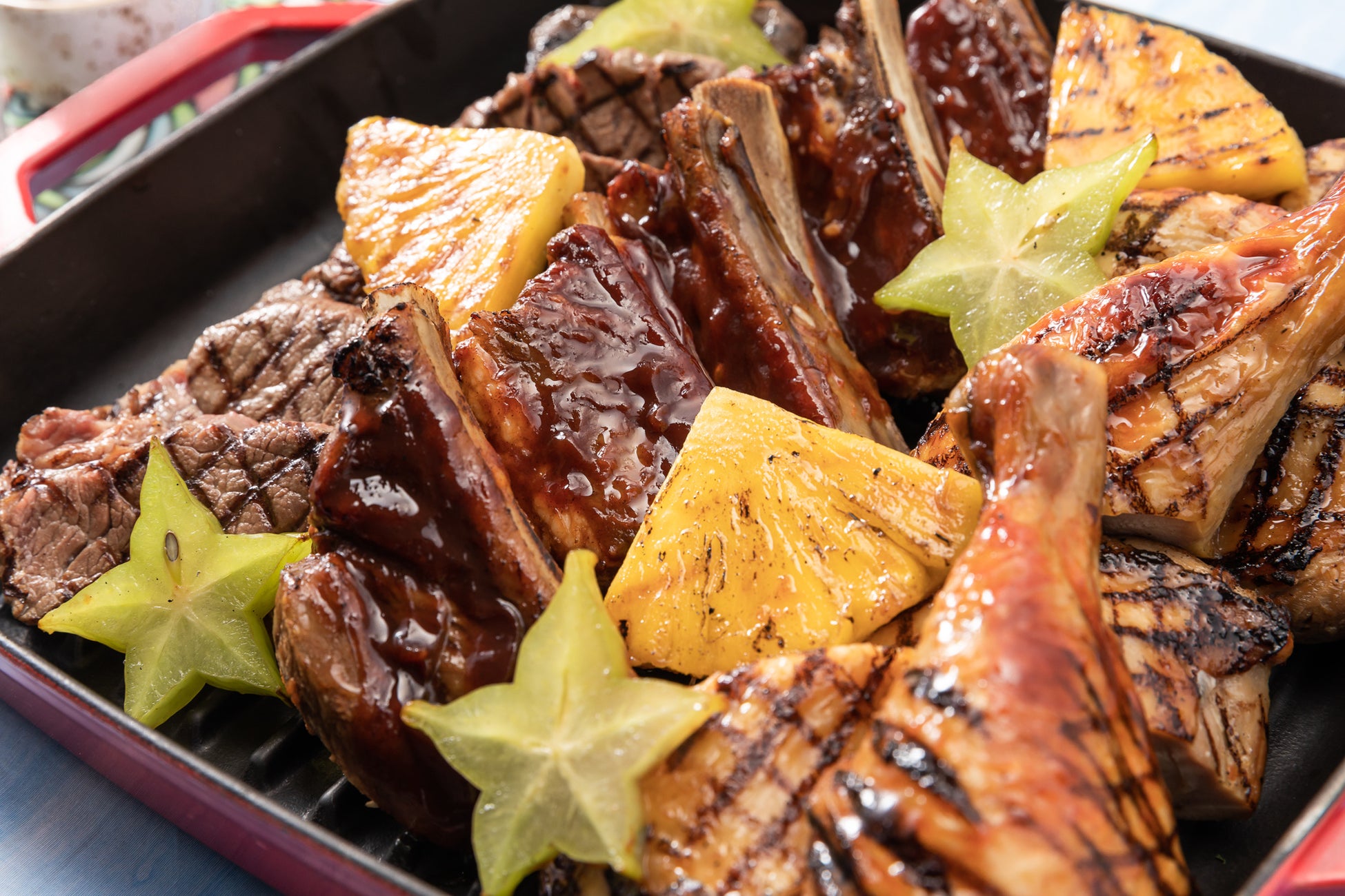 ビーフ、ハワイ風ポークスペアリブ、フリフリチキン、ガーリックシュリンプ など