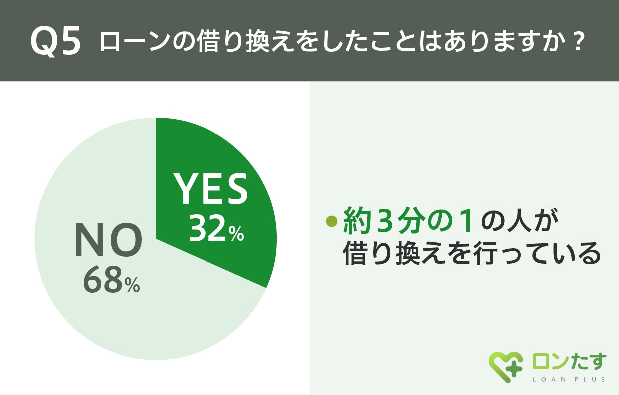 全体の約3分の1の人がローンの借り換えを経験しています。借り換えの手間を考えると多めの印象ですが、それだけ多くの人がローンの金利の動向に敏感である様子がうかがえます。今のローンより金利が低いローンがあれば、積極的に借り換えを行うべきです。