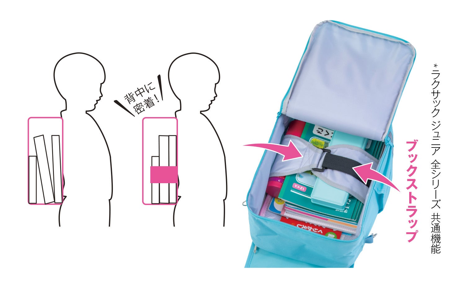 独自開発のブックストラップ(教科書固定ベルト)で厚みの違う教科書を簡単に区別し整理。重い荷物を背中側に密着させ荷物の揺れを防ぎ、身体への負担を最小限に抑えます。