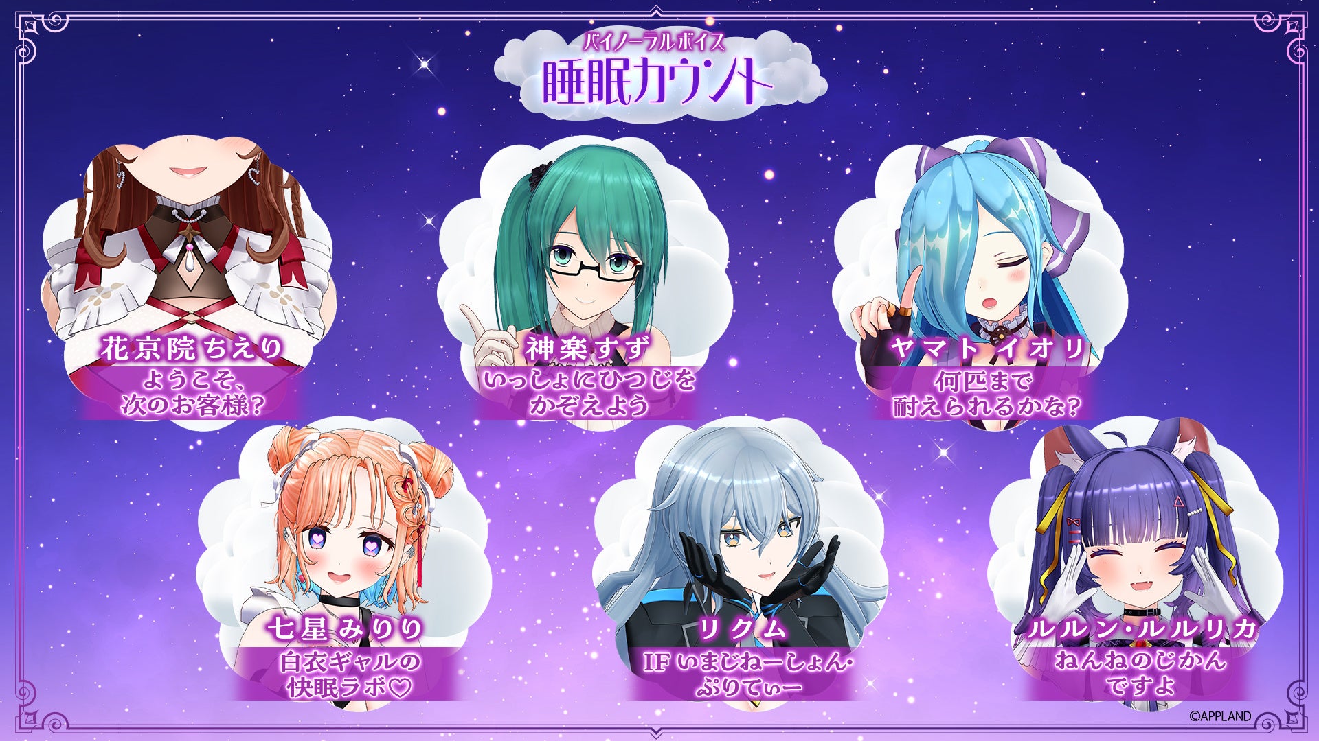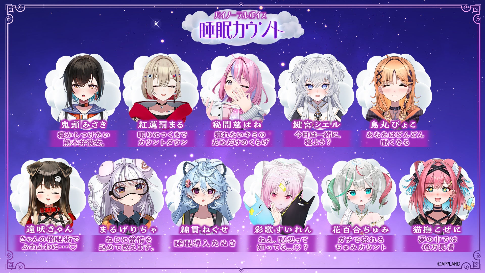 アップランド所属「.LIVE」・「ぶいぱい」メンバーによるバイノーラルボイスを5月28日(水)より販売いたします!『睡眠導入カウント』をテーマに、.LIVEメンバーとぶいぱいメンバーそれぞれが考案した、心地よい眠りへと誘うカウントボイスが楽しめるコンテンツです。是非お楽しみください!