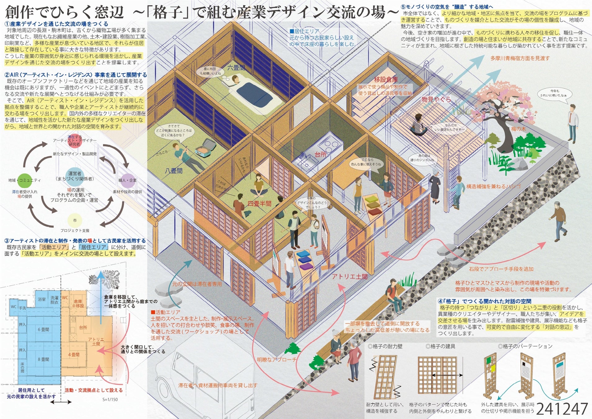 伝統的な格子の技術に着目し、既存の建物を維持しながら新たな交流拠点を創出するアイデアが高く評価されました。特に、建物を壊さずに活用し、移住者と地元住民の交流を促す姿勢は、地域活性化への貢献が期待されています。また、格子のデザインを活かしたプロダクトや空間設計の一貫性、産業デザインを通じた交流促進というユニークなコンセプトなど全体の総合力が高く、審査員からの支持を集めました。