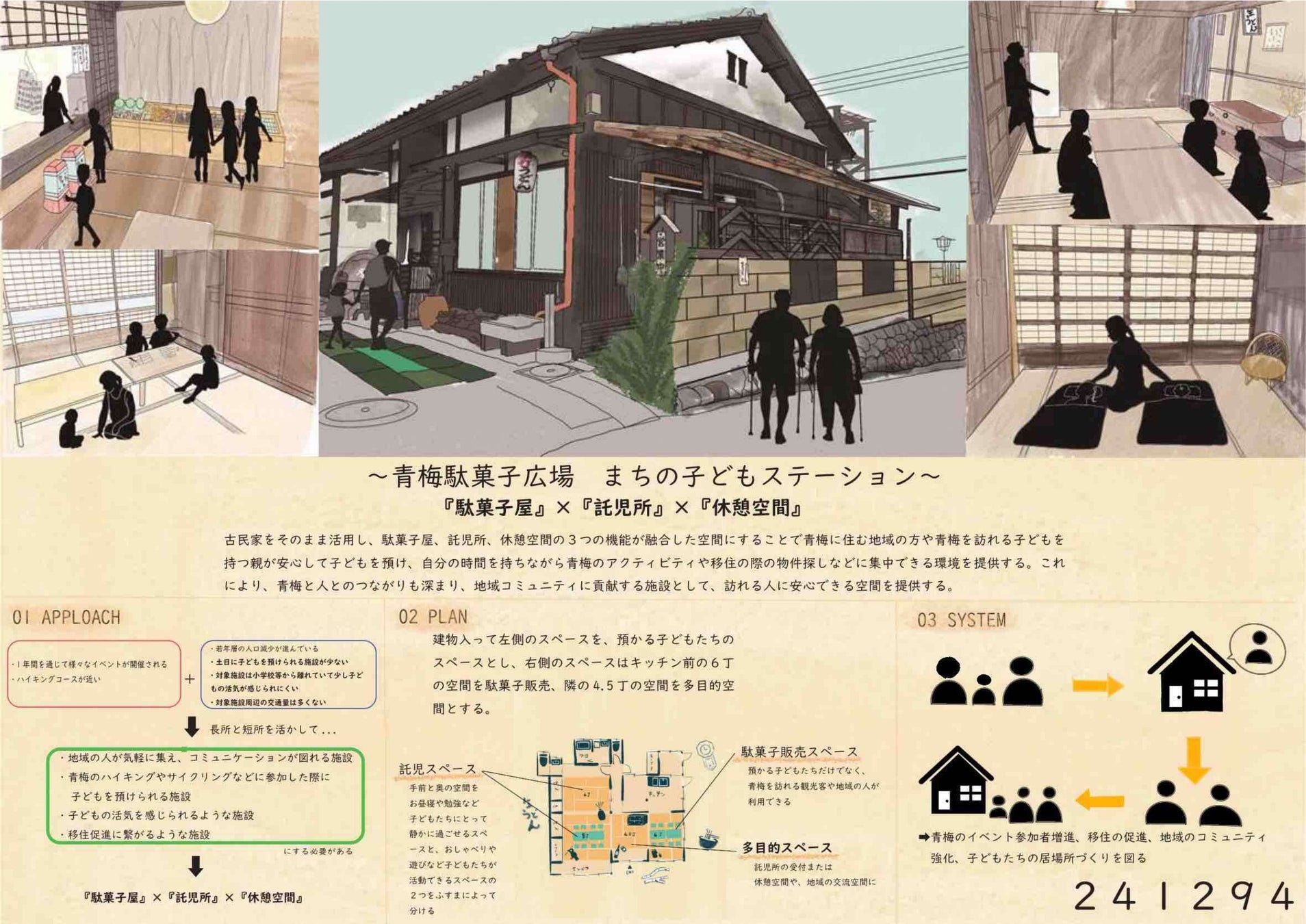 駄菓子屋が持つ、世代を超えた交流の場としての価値に着目し、さらに託児所や休憩スペースを設けることで、地域コミュニティの核となる可能性を示した点が評価されました。また、対象物件の雰囲気にも合致するアイデアであることも、受賞の決め手となりました。