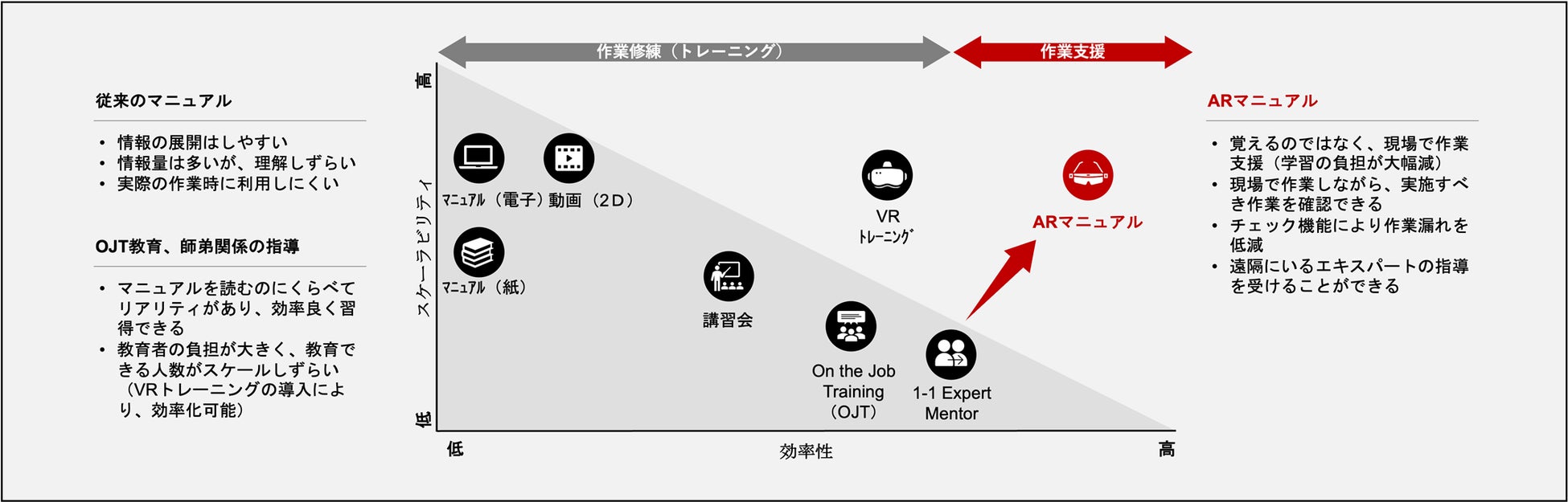 従来テキストとイラストでしか表現されなかったマニュアルから脱却し、テキスト、イラスト、映像、音声による説明、さらにはエキスパートからの遠隔支援を受けられる新たなARマニュアルを提供いたします。