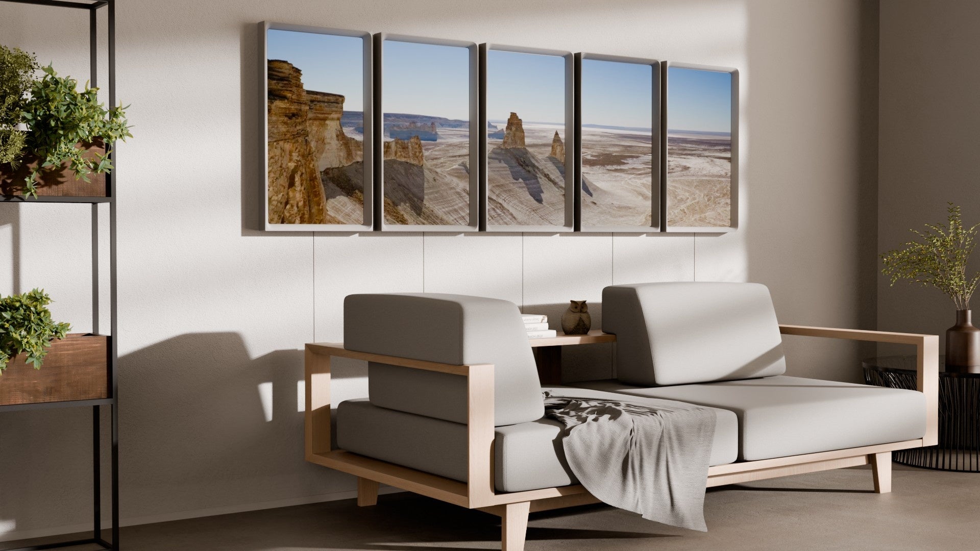 Atmoph Windowは一貫して「窓」というコンセプトにこだわり続けています。Atmoph Window Yoではフレームに奥行きを持たせ、画面を可能な限り壁に近づけることで、本物の窓のような立体感を演出しました。またGUIもガラスをモチーフとし、レイヤー構造によって視覚的な奥行きを実現しています。さらに遠景を拡大して楽しめる望遠鏡型コントローラー「Atmoph Scope」 など、窓としての体験を拡張するモジュールも揃えました。直線ではなく有機的な曲線を用いたフレームは、SF的な存在感を放ち、空間の中で静かに個性を主張します。