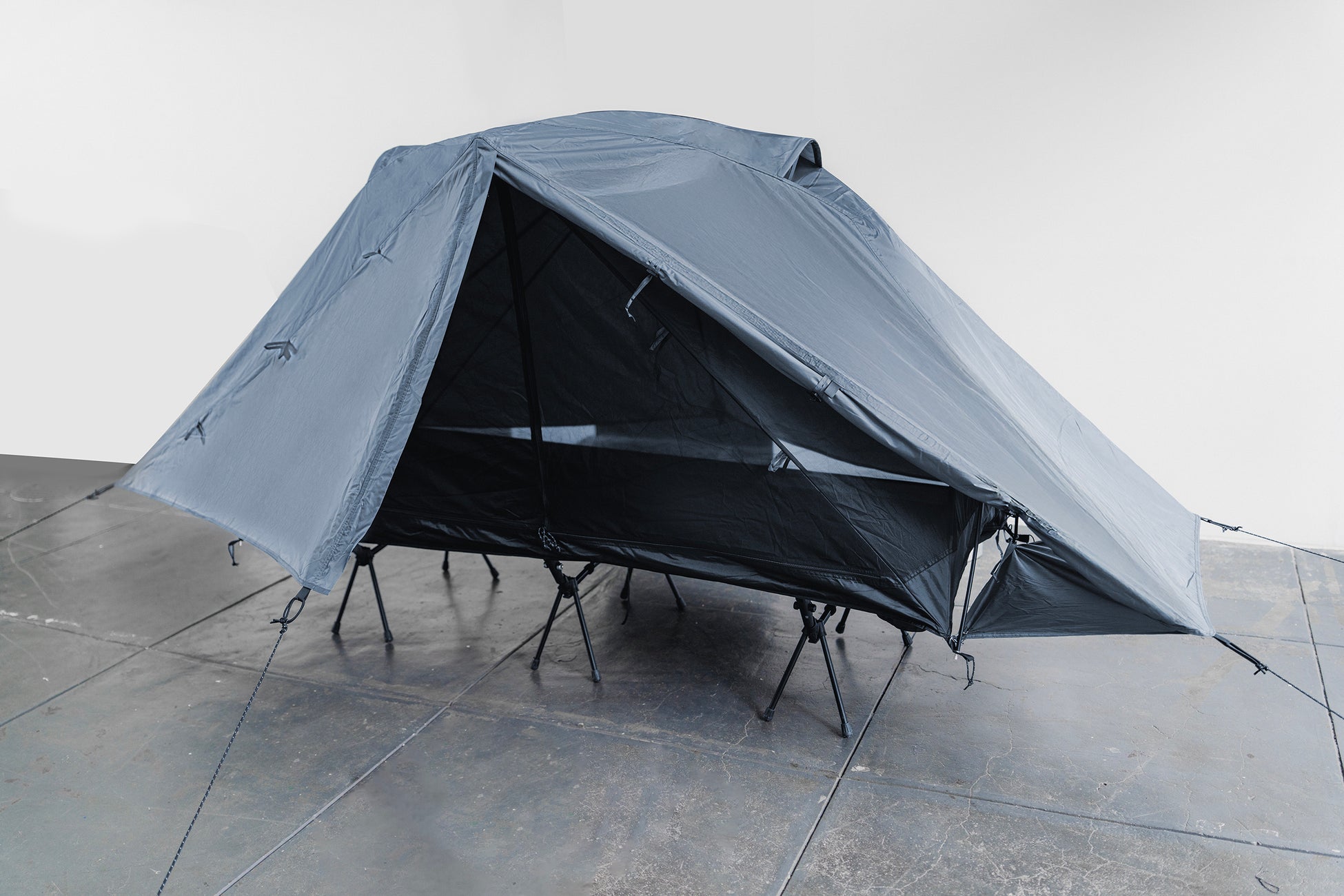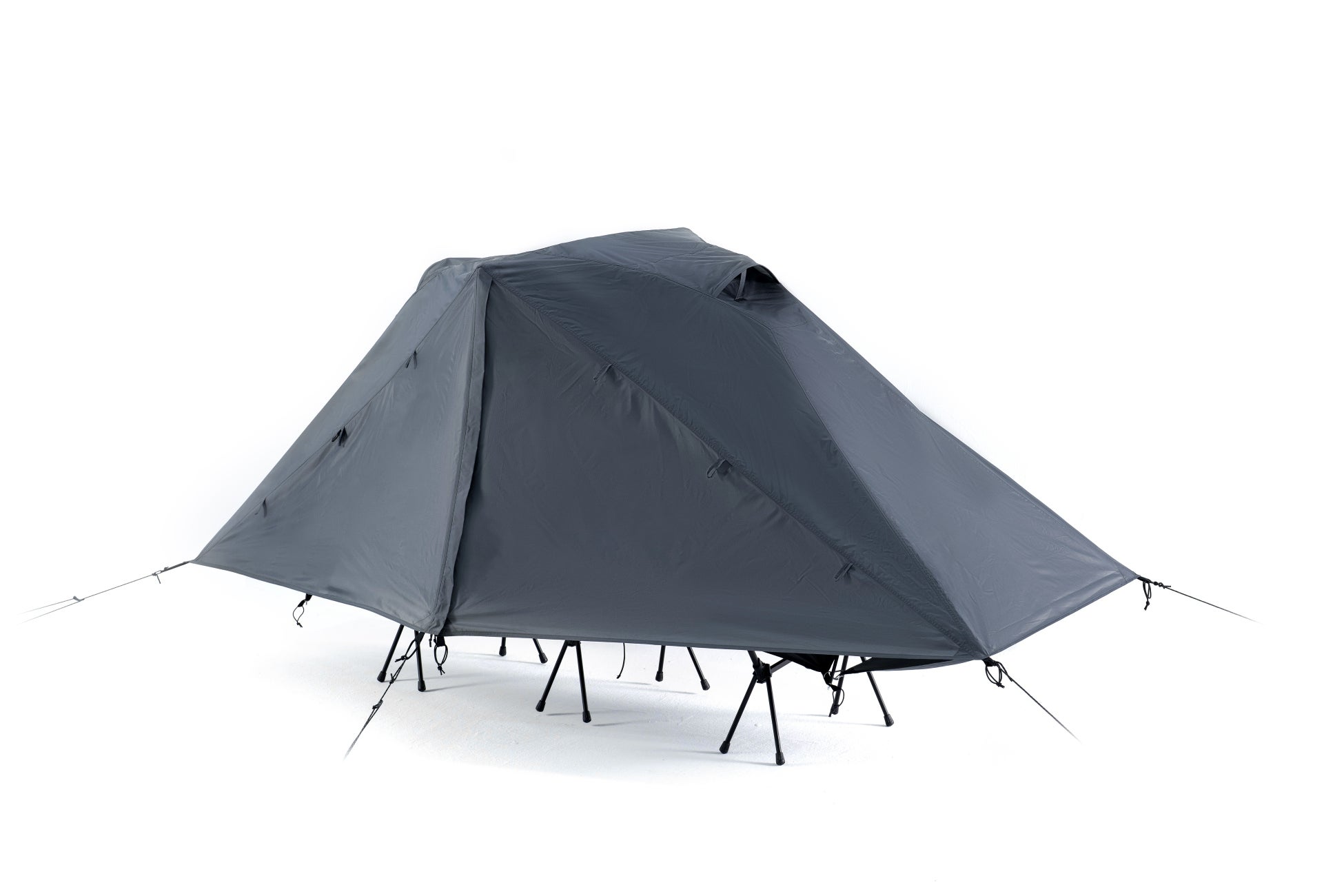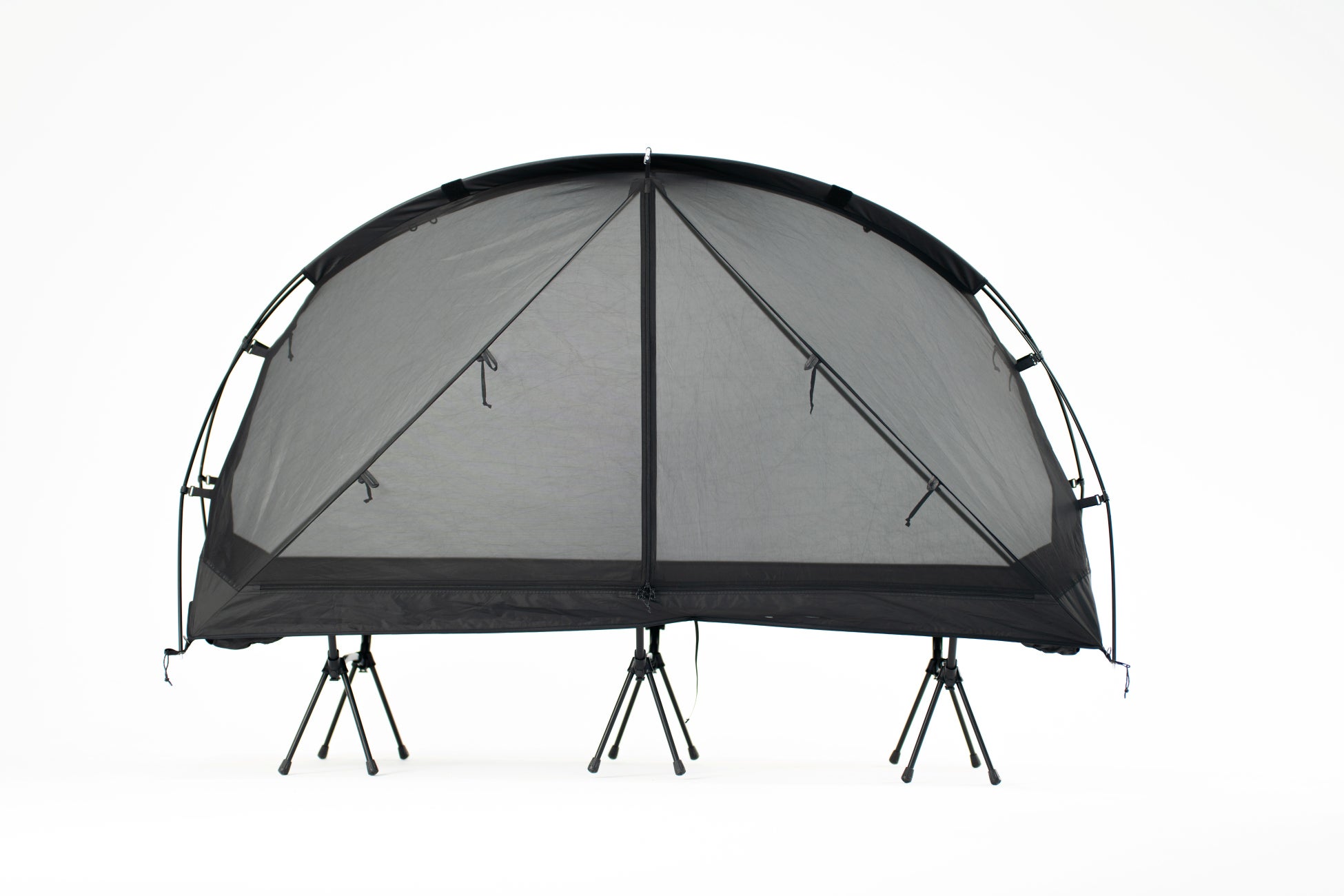 「もっと快適な寝床を作れないか?」というアイデアを具現化させた、コットの上にテントを載せる高床式スタイル。コットを使い地面から離れる事で寝心地を向上させ、設営もしやすくなります。夜露や虫、地形の影響を最小限に抑え、より快適な就寝環境を提供してくれます。コットを使わない場合でも、自立式のソロテントとして活躍し、大型のシェルターやタープの中に入れれば、二重構造の空間を作るカンガルースタイルにも対応します。3WAYで活躍するアウトドアの幅をさらに広げてくれるコットテントです。