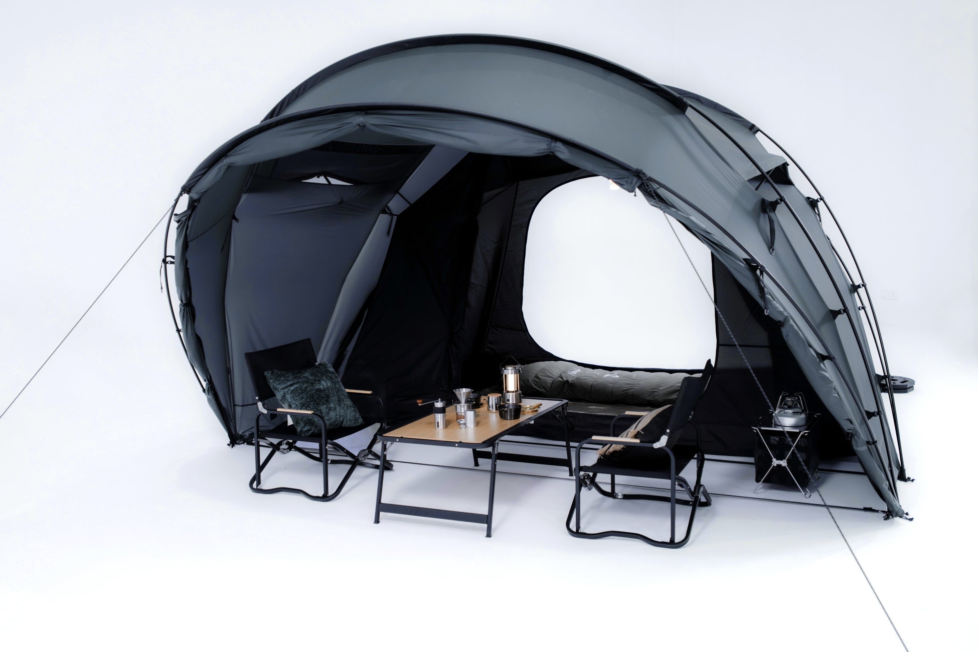 シェルター全体が左右対象なので、向きを気にする事なく設営しやすい構造を取り入れています。トンネルのようなこの構造は、両サイドに大きなパネルドアを備えており、跳ね上げる事で開放感を高めたり、キッチンやリビングスペースを拡張しやすい仕様。横幅350cmあるワイドな空間はテーブルや椅子を置いても余裕があり、高さも210cmあるので、家族やグループでもゆったり広々と過ごす事ができます。
