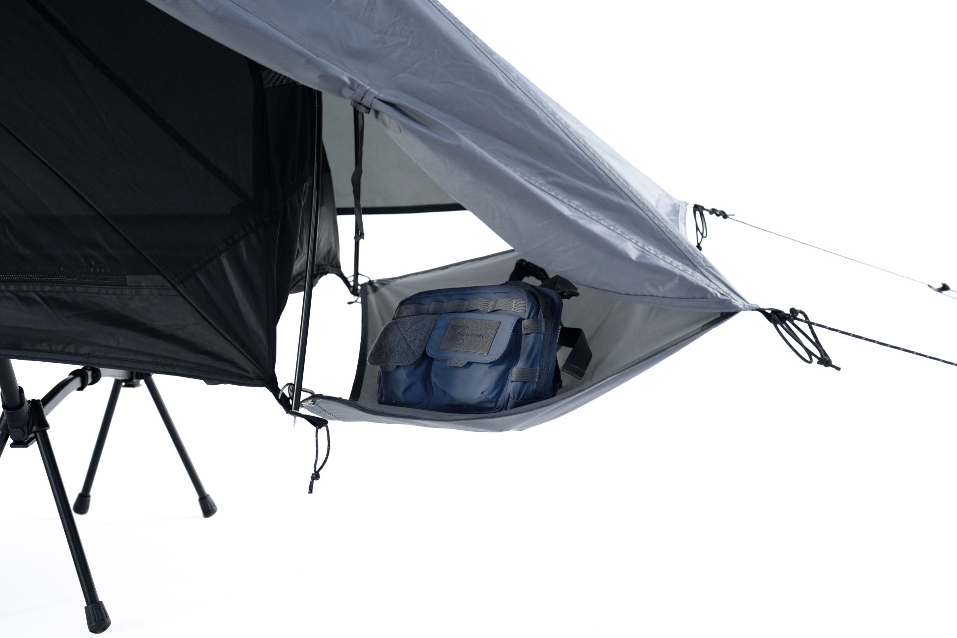 フライシートとインナーテント底部を連結するシートが付属しており、繋げる事で便利な荷物置きスペースが出現。コットテントでもソロテントでも荷物の汚れや湿気から遠ざけて保管する事ができます。インナーテント天井部にはランタンフックを配置し、夜間での照明を確保し、寝床をより使いやすくします。