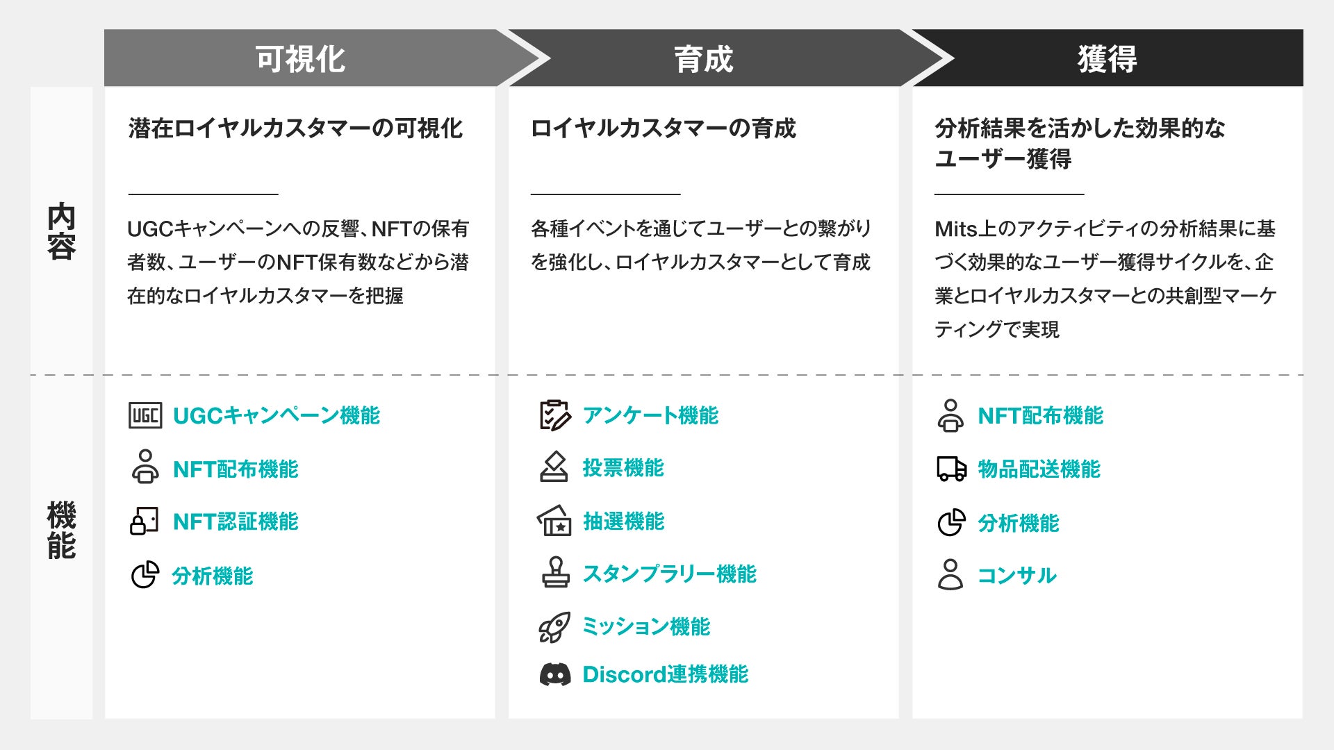 「SBINFT Mits」は、導入企業やプロジェクトが、自社データとNFTの組み合わせによりロイヤルカスタマーを可視化したうえで、その育成や獲得までをワンストップで実現するマーケティングプラットフォームです。