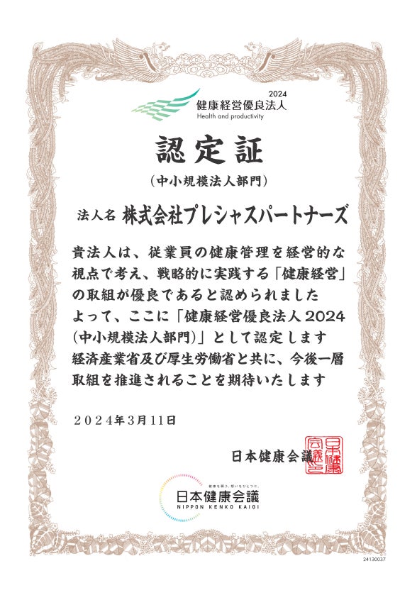 プレシャスパートナーズ、「健康経営優良法人2024(中小規模法人部門)」に認定