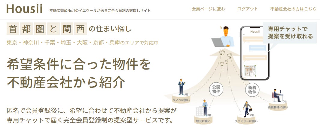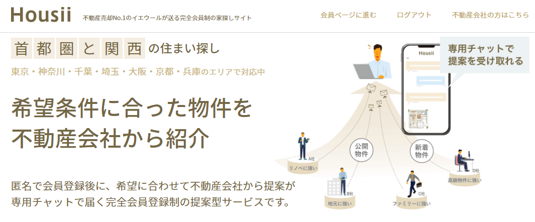 Housii(https://ieul.jp/buy/)は不動産会社から直接物件情報を受け取ることができる、完全会員制の家探しサービスです。