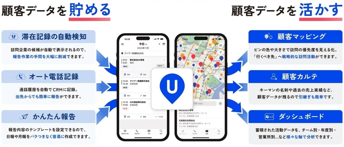 「UPWARD」はCRM・SFAの価値を最大化する「セールスエンゲージメント」を実現するアプリです。顧客データを“貯める・活かす”ことを軸に、SalesforceやMicrosoft Dynamics365といったクラウドCRMと連携し、外回り・訪問営業の方々がより創造的に働けるよう、多様なサポート機能を提供します。