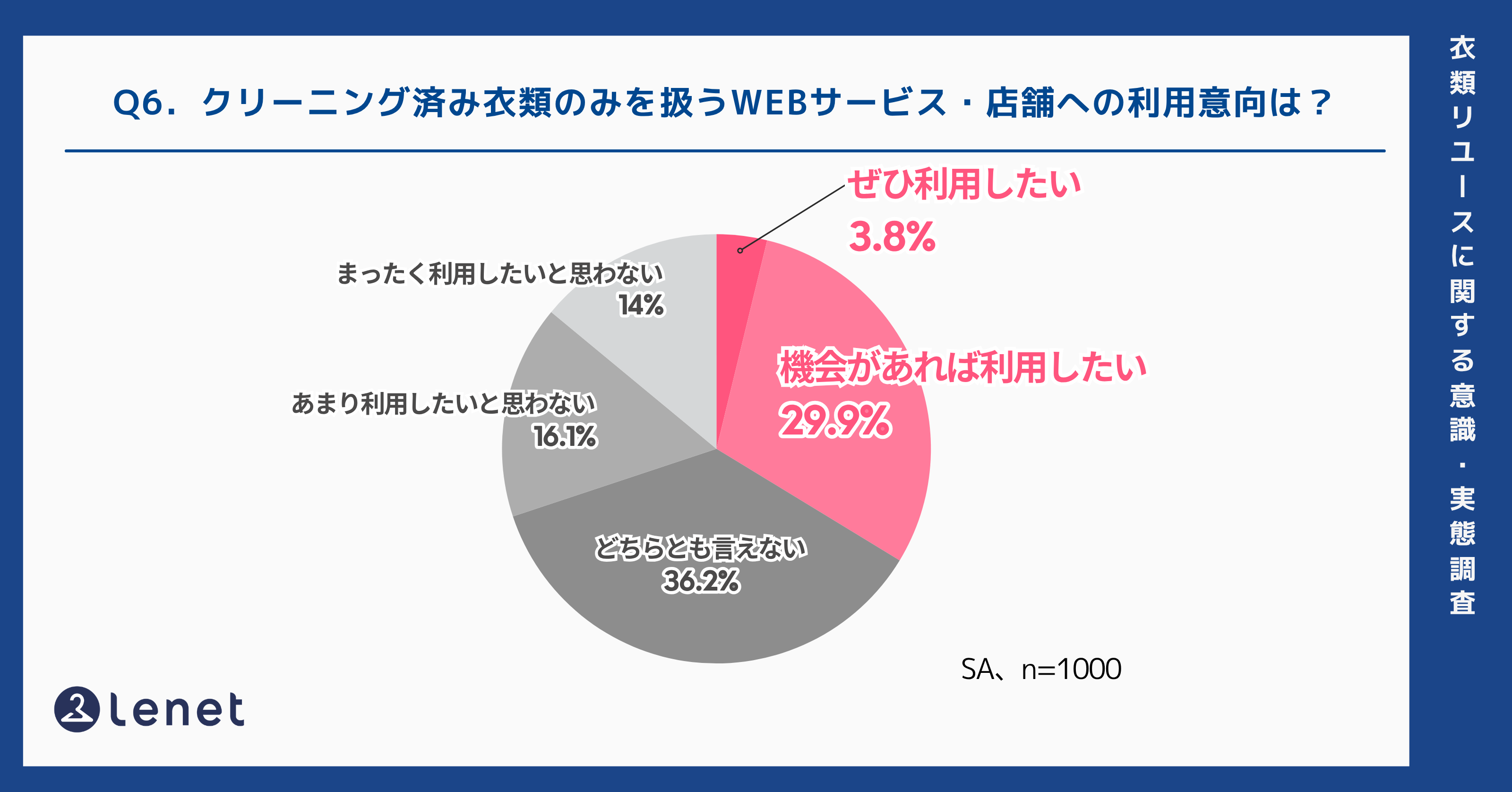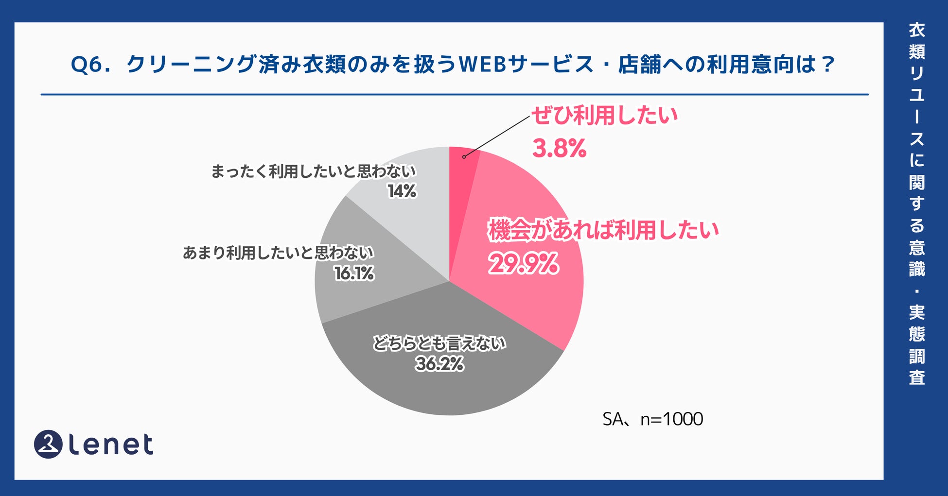 最後に、クリーニング済みの衣類・かばん・靴のみを扱うWEBサービス・店舗への利用意向を尋ねました(単一回答)。