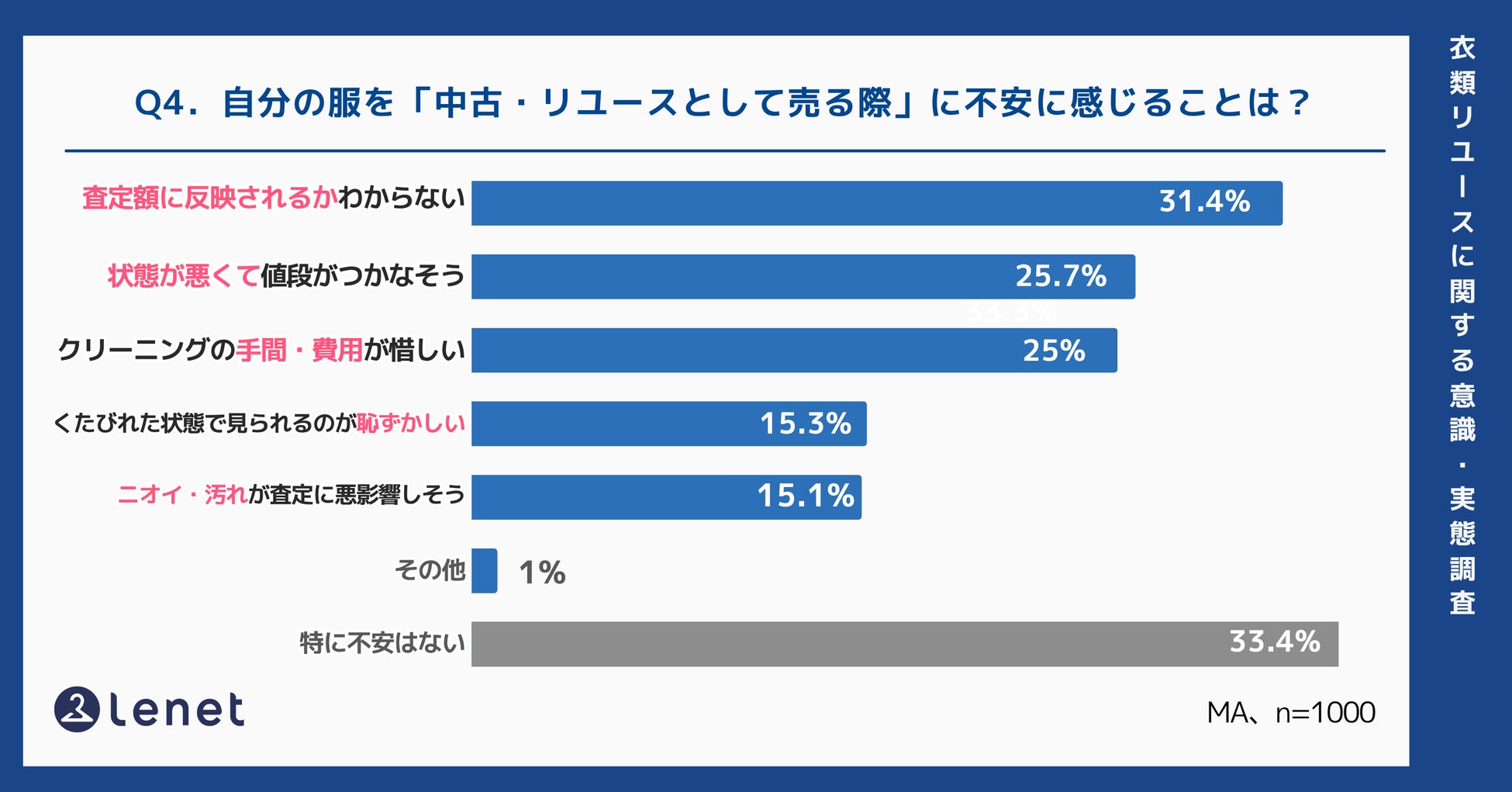 服を売る際にも66.6%が不安を感じており、最多は「きれいにしても査定額に反映されるかわからない」31.4%