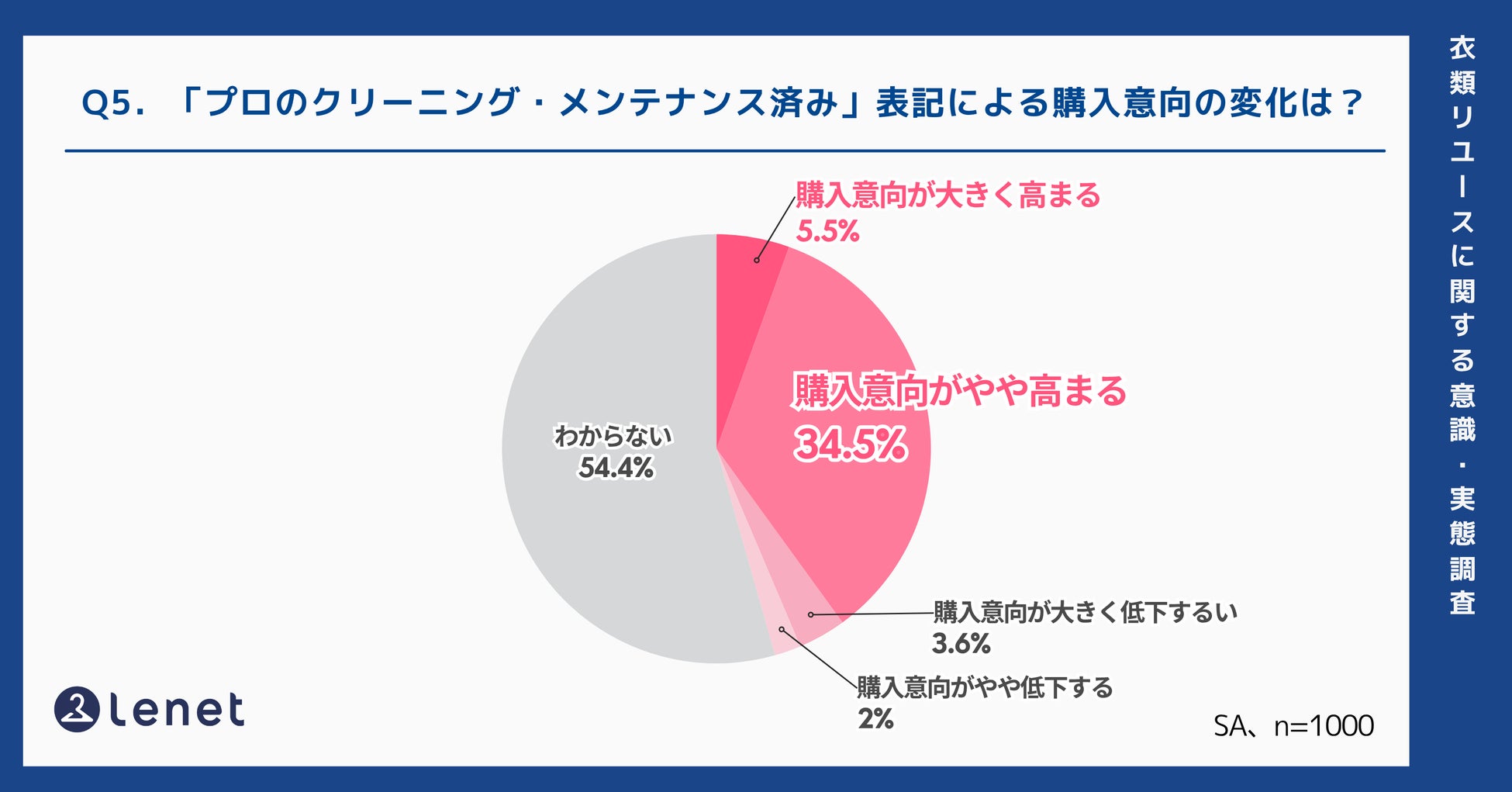 「変わらない」が54.4%を占めますが、この層にはQ4で「特に気になる点はない」と回答した層(29.4%)が含まれると推察されます。中古衣類の購入に不安を感じていた70.6%の層に限れば、クリーニング済み表記がポジティブに作用した割合はさらに高いと考えられます。「清潔さへの不安」という購買障壁に対して、プロのクリーニング技術が直接的かつ定量的に有効であることを示すデータとなりました。