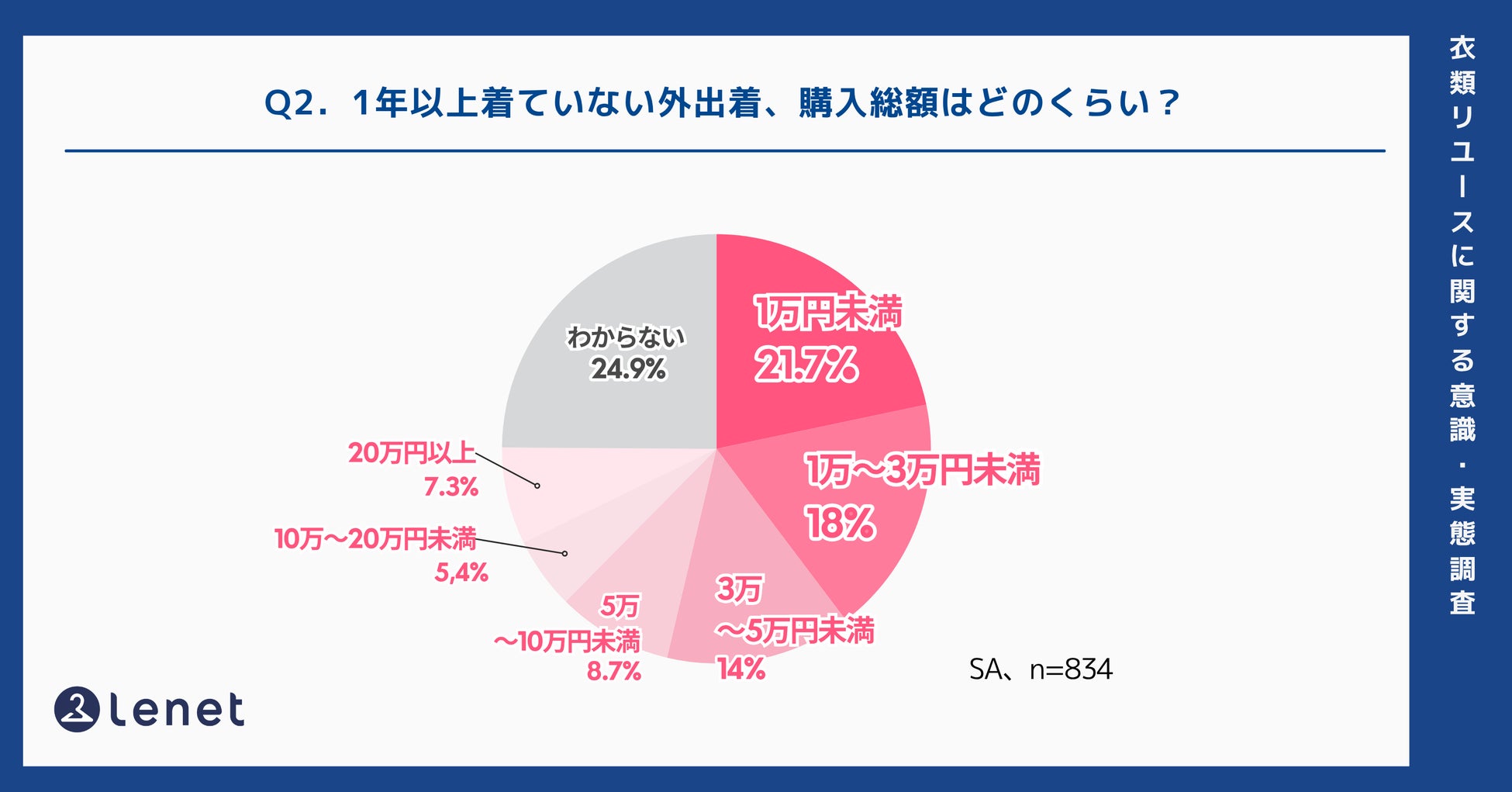 「わからない」を除く回答者のうち、購入総額が3万円以上の層は38.5%、5万円以上は21.4%、「20万円以上」と答えた層も7.3%存在しており、クローゼットの中に相当な金額の着ない服が眠っている実態が数値で裏付けられました。