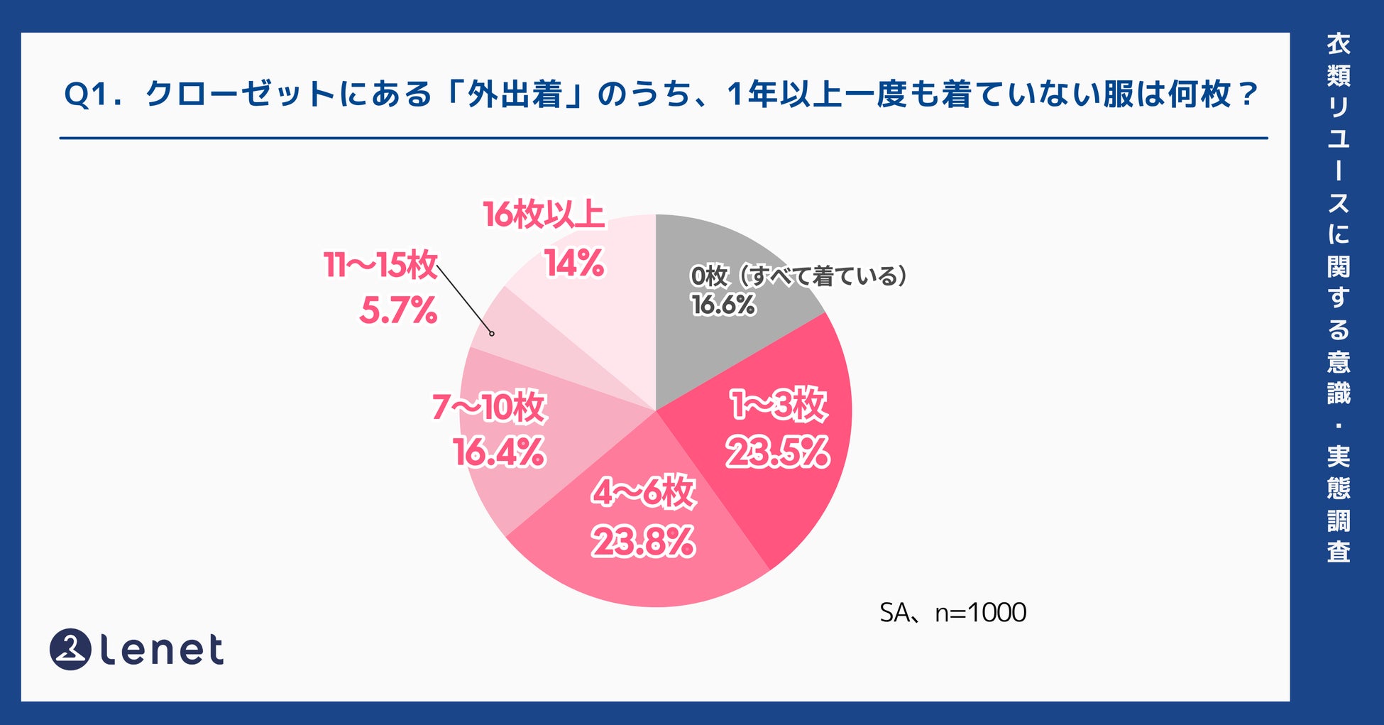 まず、クローゼットにある外出着(アウター・トップス・ボトムス・ワンピースなど)のうち、1年以上一度も着ていない服の枚数を尋ねました。