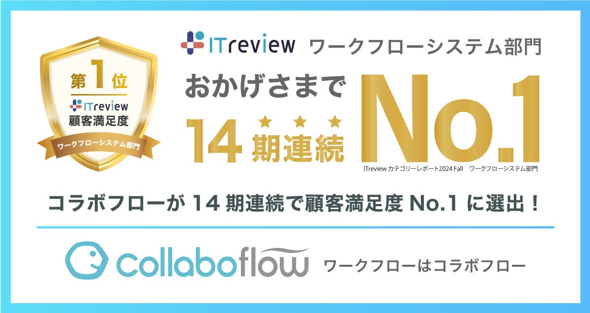 「ワークスタイルの未来を切り拓く」を理念に掲げる株式会社コラボスタイル(所在地:愛知県名古屋市、代表取締役社長 兼 CEO:松本 洋介)は、開発・提供しているクラウドサービス「コラボフロー」が、国内最大級のIT製品・SaaSレビューサイト「ITreview」が発表する 「ITreview カテゴリーレポート 2024 Fall ワークフローシステム部門」 において、14期連続で顧客満足度No.1に選出されたことをお知らせします。