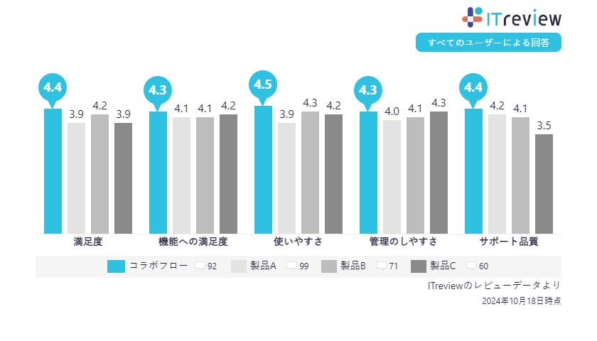 さらに、ユーザーからの各評価項目「機能への満足度」「使いやすさ」「管理のしやすさ」「サポート品質」「価格への満足度」においても、それぞれ満足度No.1を獲得しました。