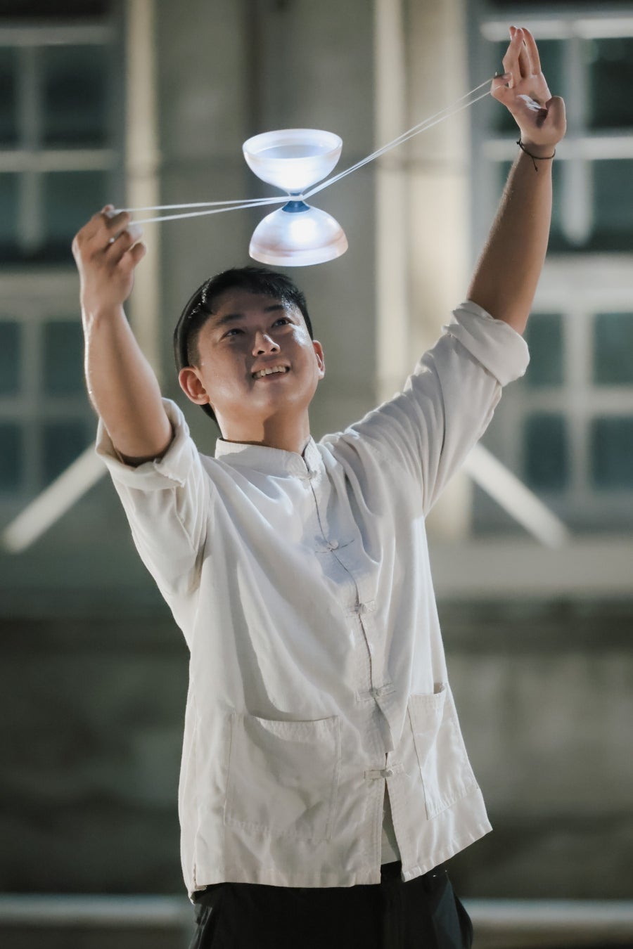 台湾出身のアーティスト。伝統的なサーカス芸の枠を超え、書道、けん玉、視覚芸術を融合させた独自のパフォーマンスを確立。緻密なコントロールと静謐で力強い身体表現により、観る者を圧倒する唯一無二の舞台を創り出す。