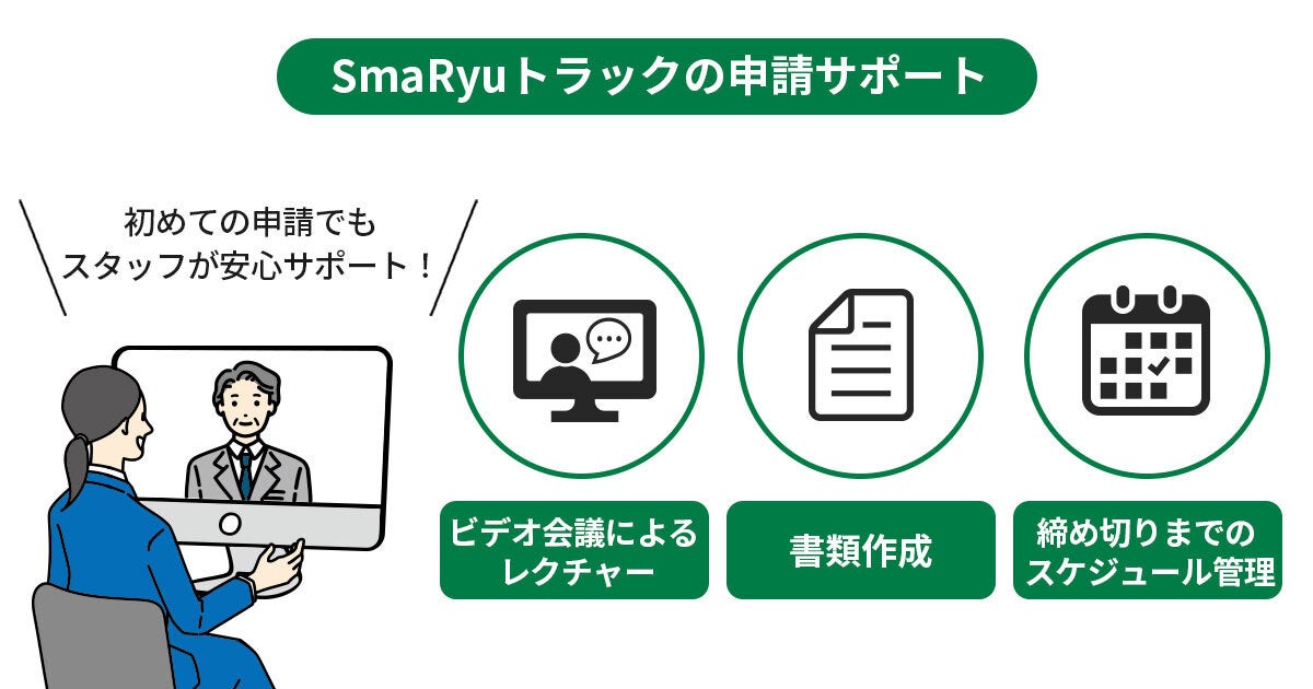 「SmaRyuトラック」ではお客様の申請にあたり、申請サイトへのログイン方法や、必要書類の取得方法など、申請に必要な事前準備から資料作成まできめ細かいサポートを用意しています。ぜひこの機会に本制度をご活用いただき、運送業務のDX推進にご活用ください。