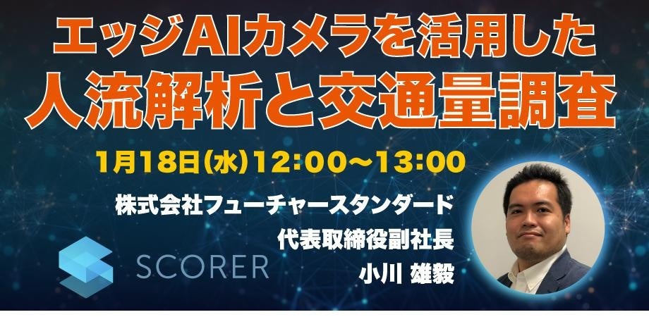 映像解析AIプラットフォーム「SCORER(スコアラー)」を運営するフューチャースタンダード(本社:東京都台東区、代表取締役:鳥海哲史 以下、フューチャースタンダード)は、1月18日(水)12時に無料ウェビナーを開催し、エッジAI「SCORER Traffic Counter Edge」をご紹介いたします。