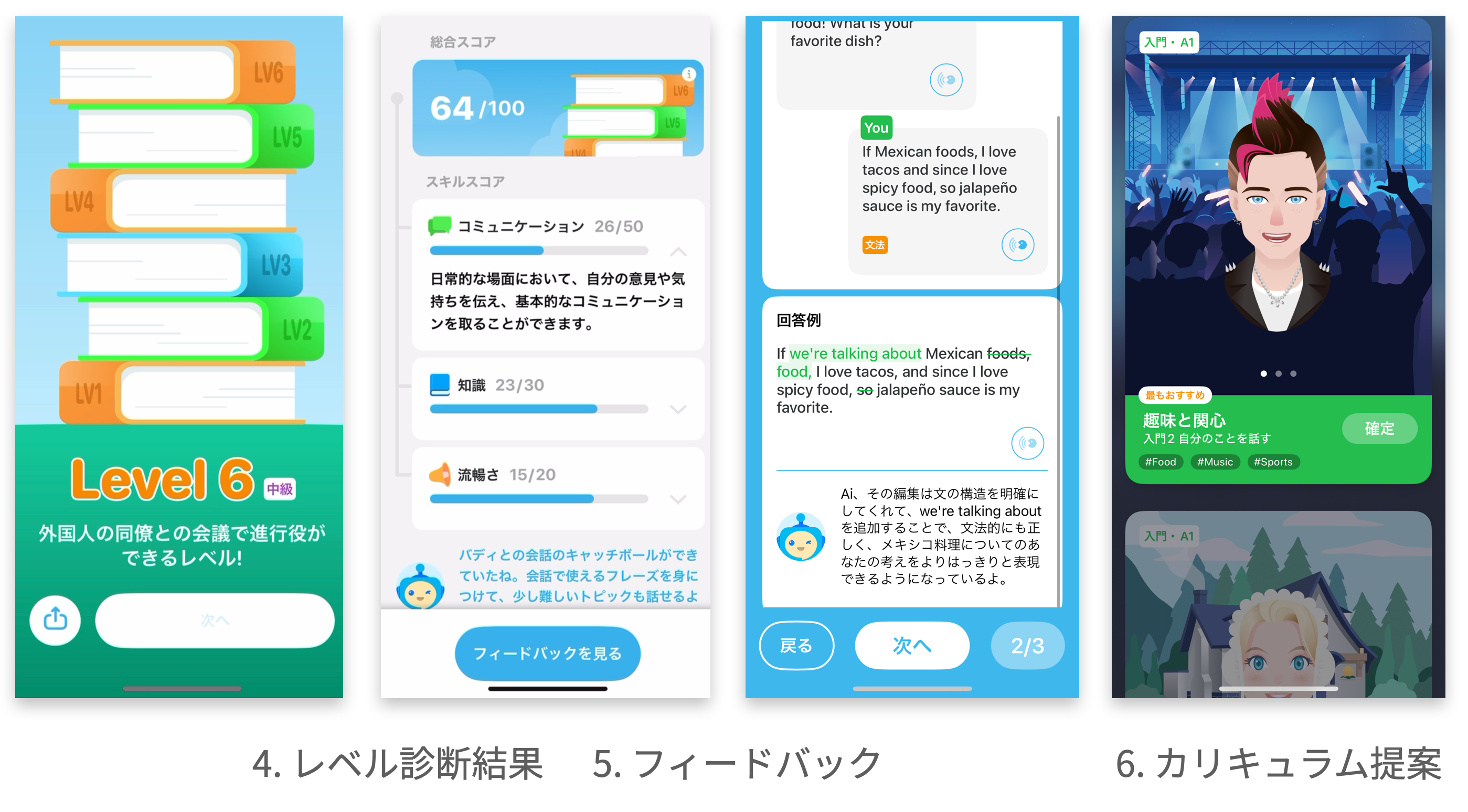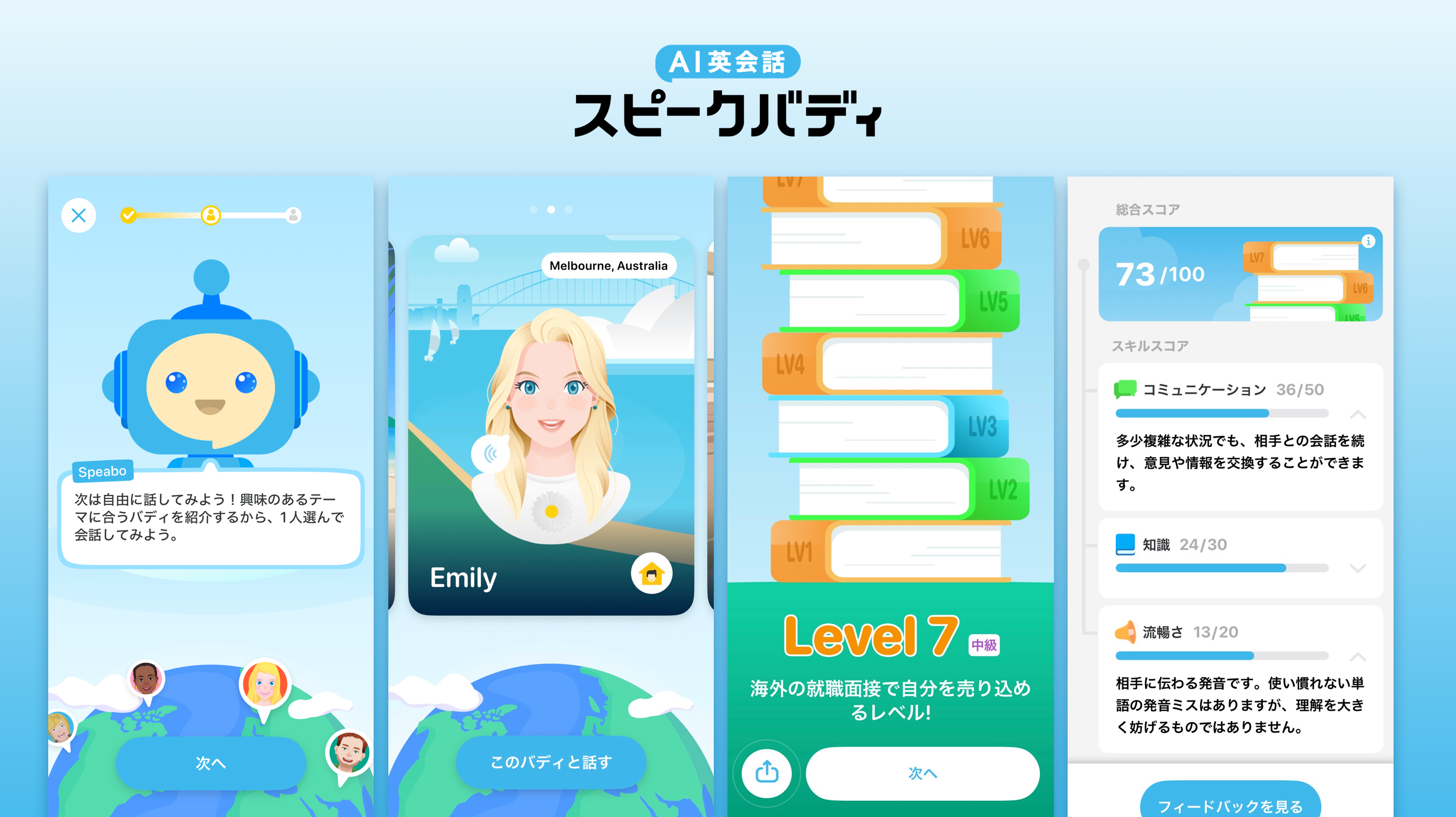 約10分間、世界中のAIバディと気軽な会話を楽しむだけで現在の英会話レベルが分かる