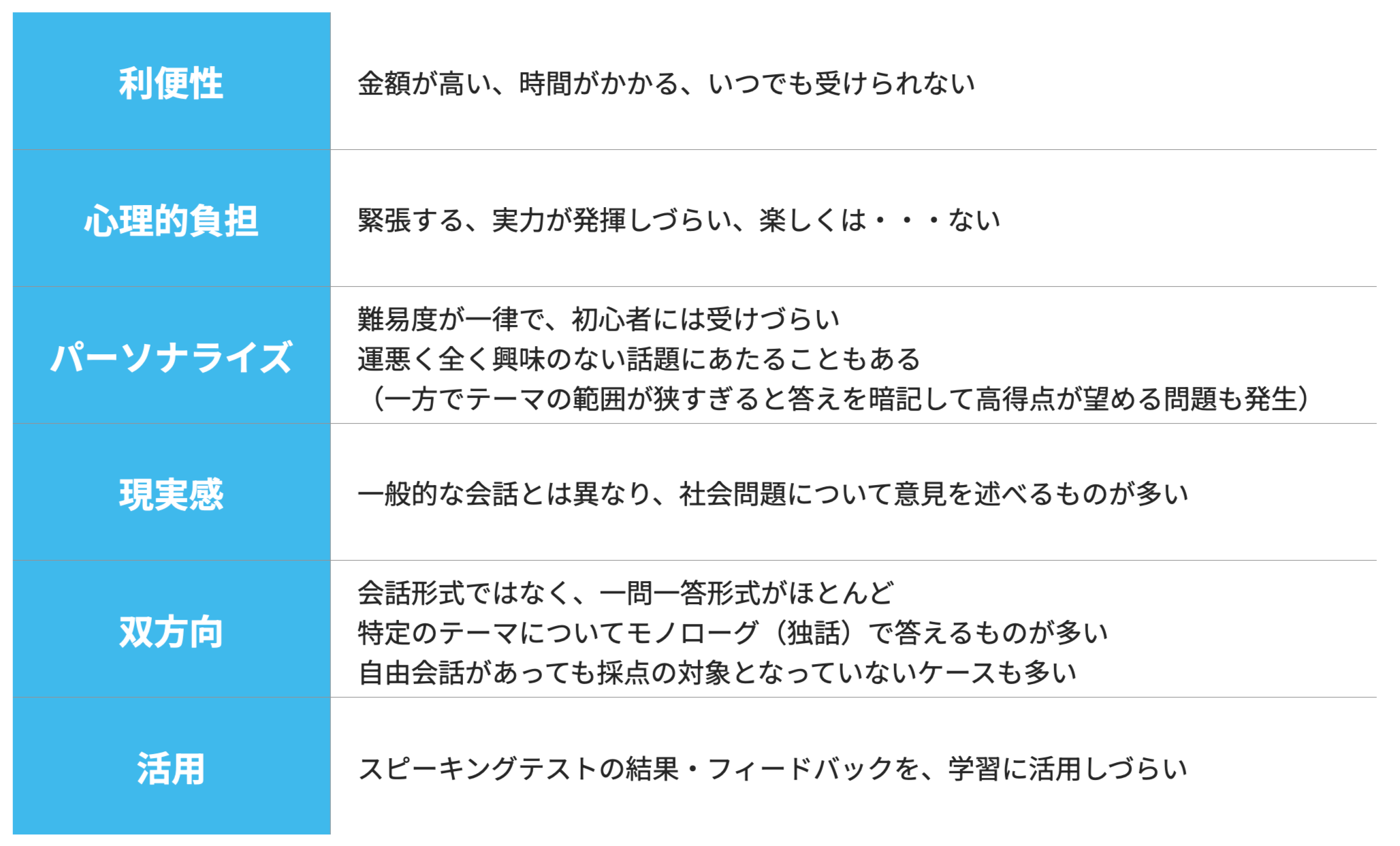 従来のスピーキングテストには対人型・オンライン型ともに「双方向性」や「心理的負担」などに課題