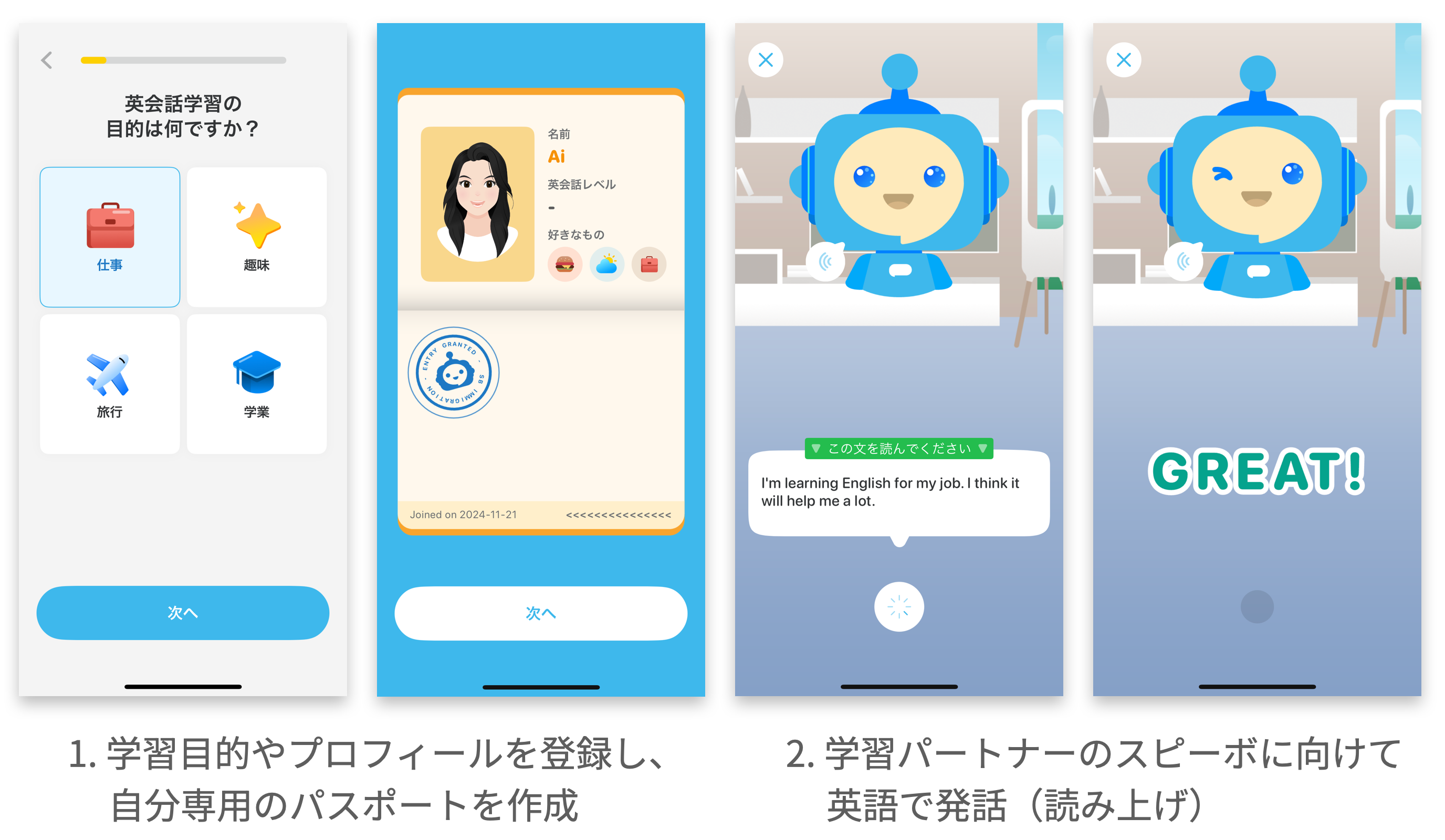 2.学習パートナーのSpeabo(スピーボ)に向けて英語で発話(読み上げ)