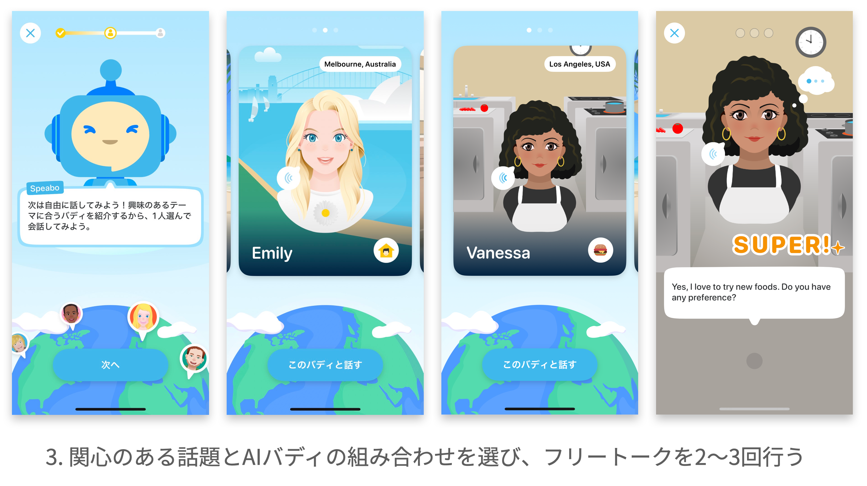 3.関心のある話題とAIバディの組み合わせを選び、フリートークを2〜3回