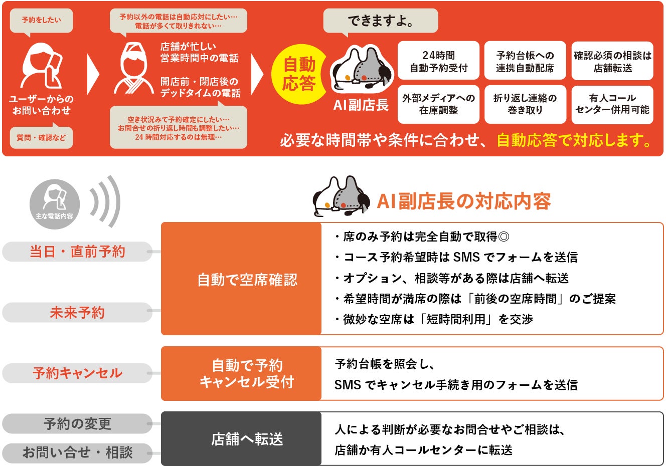 AI副店長は、飲食店にかかってくる電話をお客様との対話から自動で判別し、予約受付やよくあるお問い合わせ対応を担う、飲食店特化型音声対話システムです。