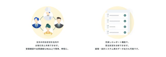 FAXや電話といったアナログな受発注業務を簡単にデジタルに置き換えられる受発注システムです。発注側はスマホやPCで数クリックで発注可能、受注側もインターネットが繋がる環境であればどこでも注⽂を受けることができます。