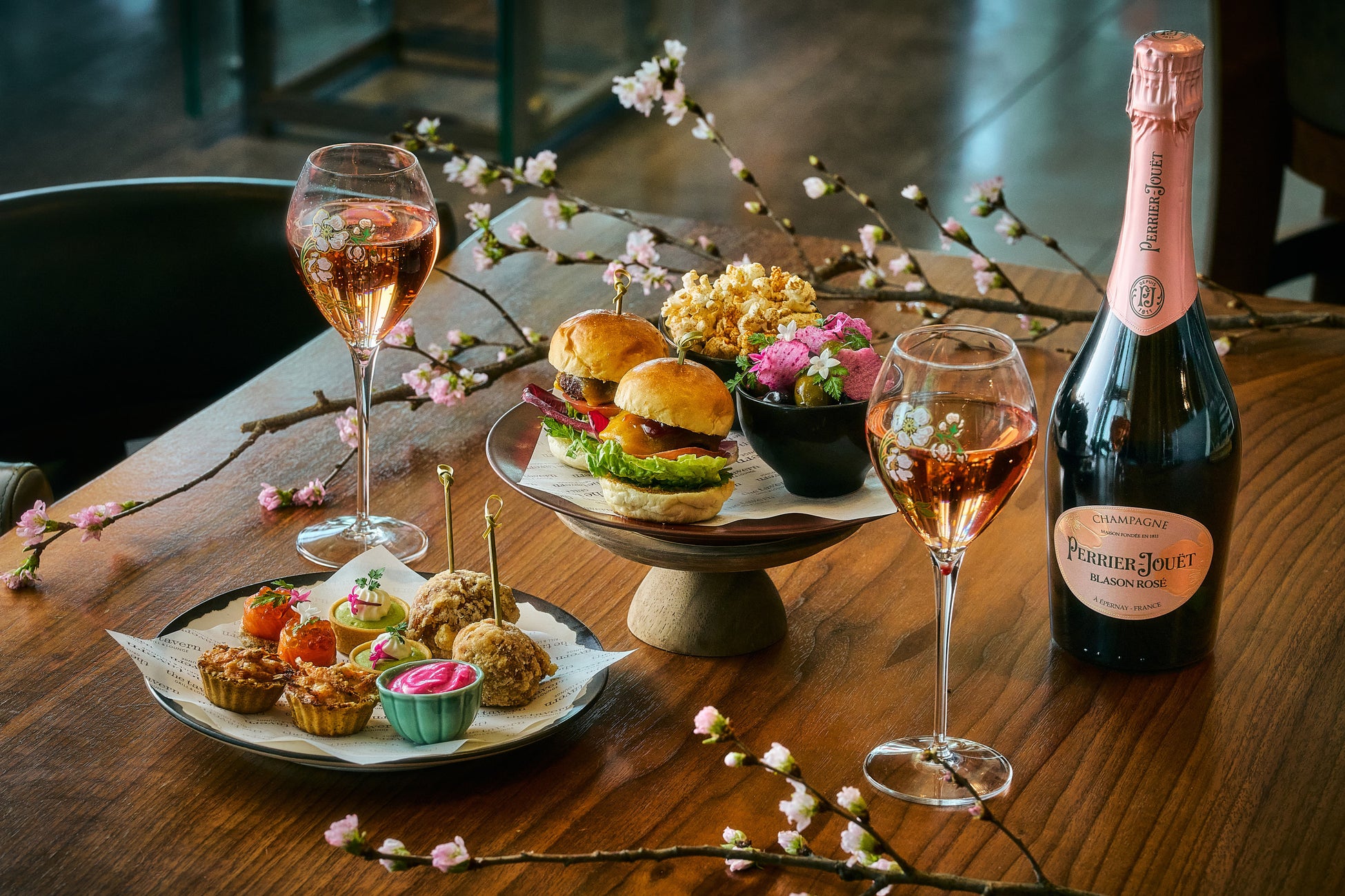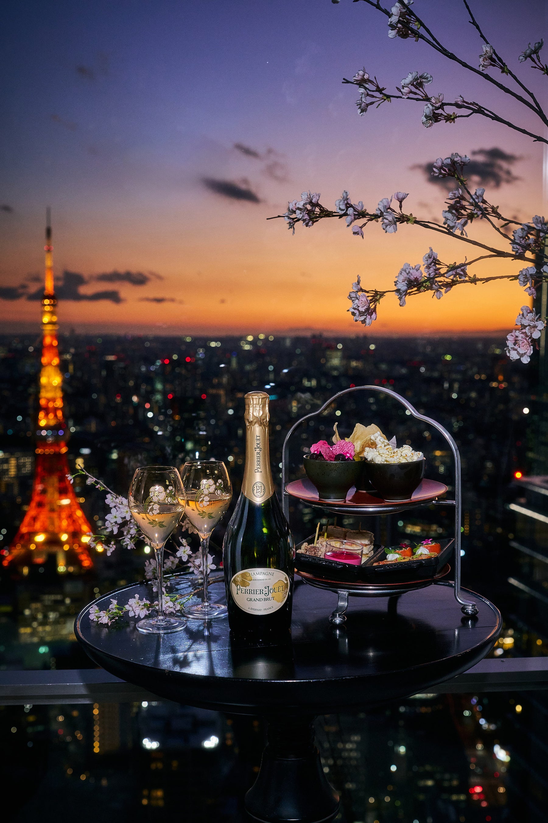 また、ラウンジエリアでは、色とりどりの春の味覚を楽しめるカナッペと、ペリエ ジュエのロゼ シャンパーニュまたはスパークリングワインのフリーフローがセットになった「桜アペリティフ」を期間限定でご提供いたします。桜の装飾で彩られた店内にて、高層階からの景色とともに春の訪れを感じる華やかなペアリングをお楽しみください。