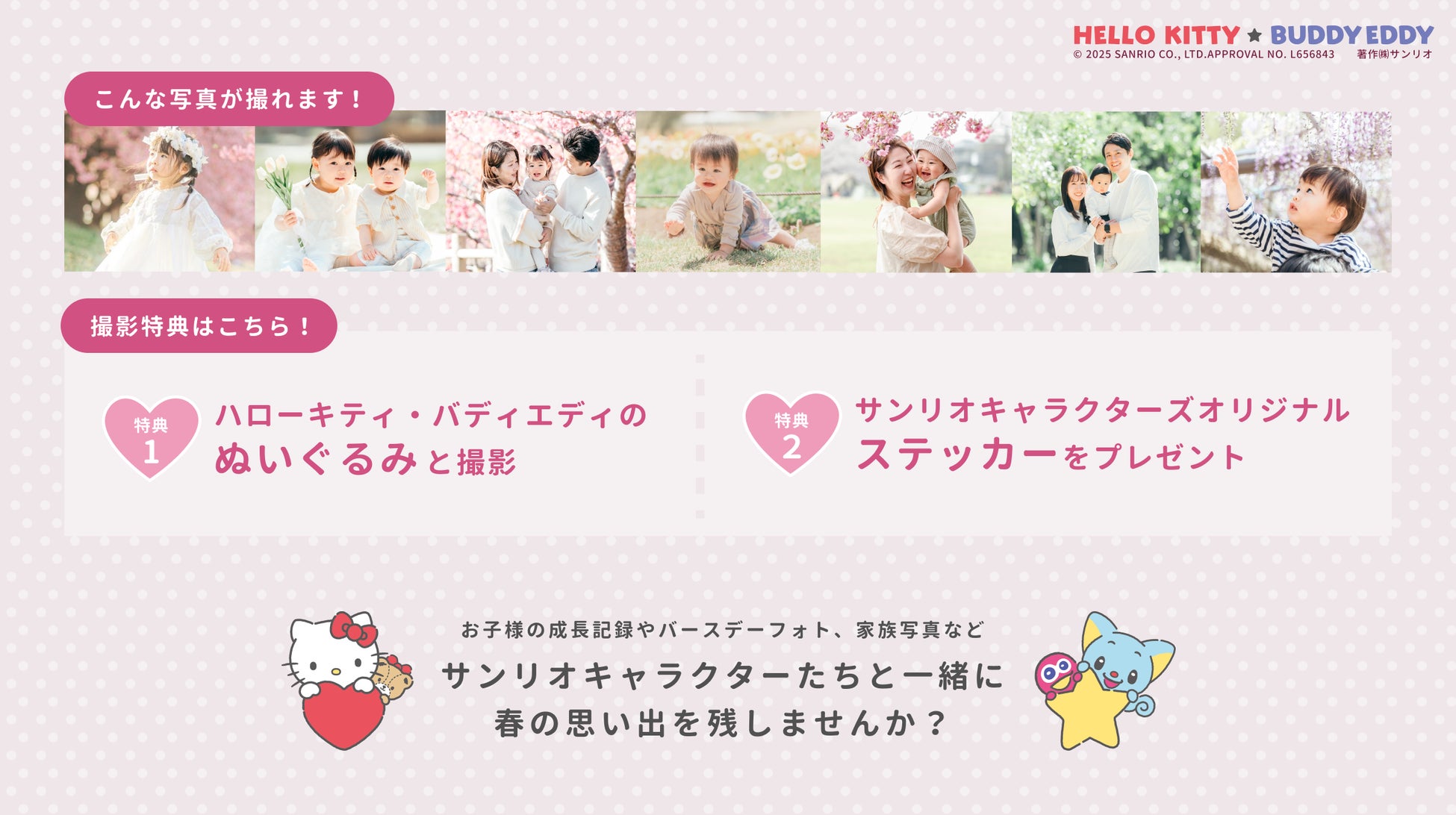 全国で毎月開催中のキッズ撮影会は、サンリオのキャラクターと期間限定でコラボし、期間中は「ハローキティ」「バディエディ」のぬいぐるみと一緒に撮影ができたり、撮影会限定の「オリジナルステッカー」をその場でプレゼントいたします。