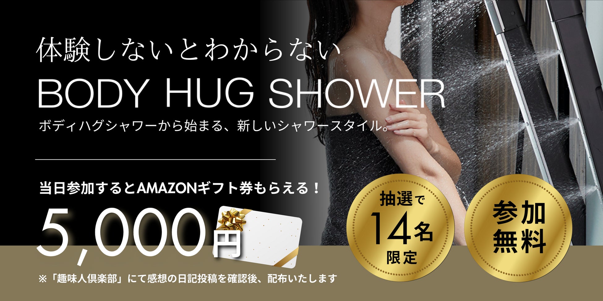 事前アンケートにご回答いただいた方の中から抽選で100名の方に、500円分のamazonギフト券をプレゼント。さらに、体験入浴後、趣味人倶楽部へ日記投稿いただいた方には、もれなく5,000円分のamazonギフト券をプレゼントします。