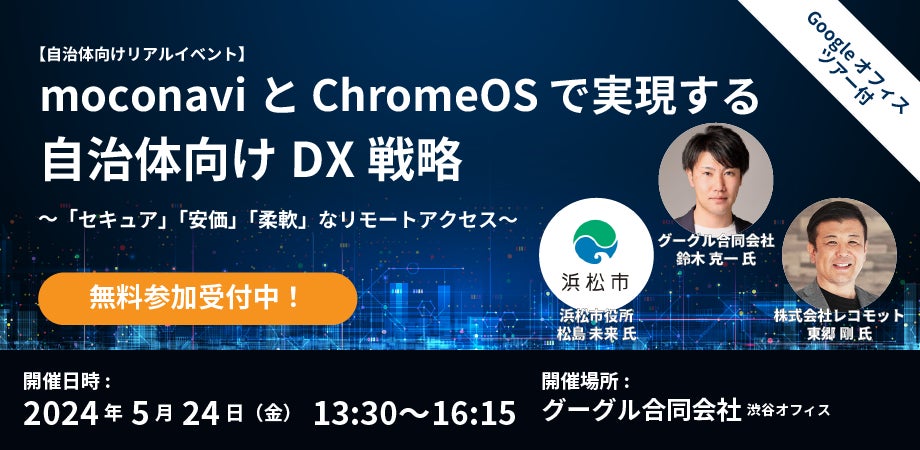 お披露目として、Chromebookを活用した事例セミナーを2024年5月24日(金)にグーグル合同会社渋谷オフィスにて開催いたします。利便性と導入容易性を高めたmoconavi RDS LGWANリモートアクセスサービスをご体感いただくことが可能です。自治体の皆様ならびに自治体関連のビジネスをご展開の事業者様におかれましては、是非ご参加いただきたくお願い申し上げます。