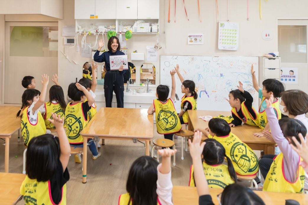 公園から保育園に戻った園児たちは、疲れた顔も見せず、興奮冷めやらぬ様子で「おそうじ本舗」のスタッフによるまとめのミーティングに参加しました。
