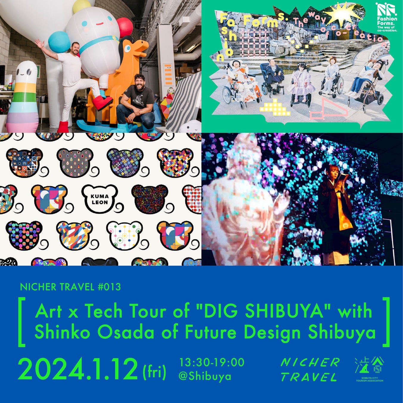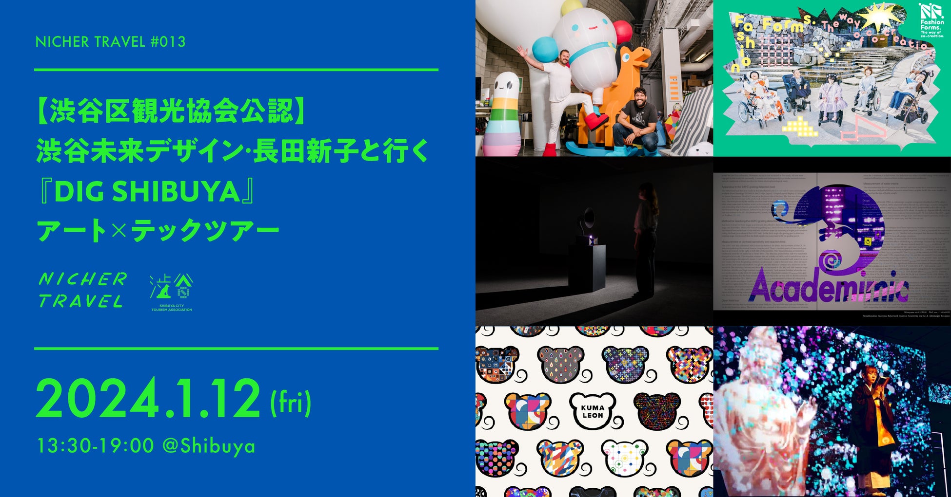 今回インバウンド向けに開催する渋谷区観光協会公認ツアー「ニッチャートラベル」では、渋谷区で先端テクノロジー推進や実装支援を担ってきた一般社団法人渋谷未来デザインの長田新子さんがナビゲートを務めます。ツアー内容はDIG SHIBUYAのアート企画を担当したスタートバーンの施井泰平さんからお話を伺うガイダンスをはじめ、関係者やアーティストとの交流もできる特別な体験ツアーとなります。渋谷区観光協会公認「ニッチャーツアー」の渋谷を対象としたツアーにて、インバウンドをメインターゲットとするのは初の試みとなります。