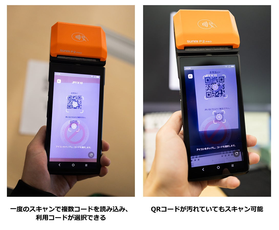 今回のアップデートでは、QRコード読み取りの際に、画面内にQRコードやバーコードなどが複数あっても瞬時にすべて認識・スキャンし、決済端末上で利用するコードを選択できるようになります。これまでは画面内に複数コードがあった場合、誤って隣のコードを認識してしまうと、正しいコードを再度スキャンしなおす必要がありましたが、そのストレスを解消します。さらに、読み込みスピード自体が速くなるほか、コードの認識機能も向上し、斜めなど幅広い角度からの決済用コードのスキャンが可能になります。コードの一部が見えづらい場合や、明るさが十分でない場所でもスキャンが可能になります。