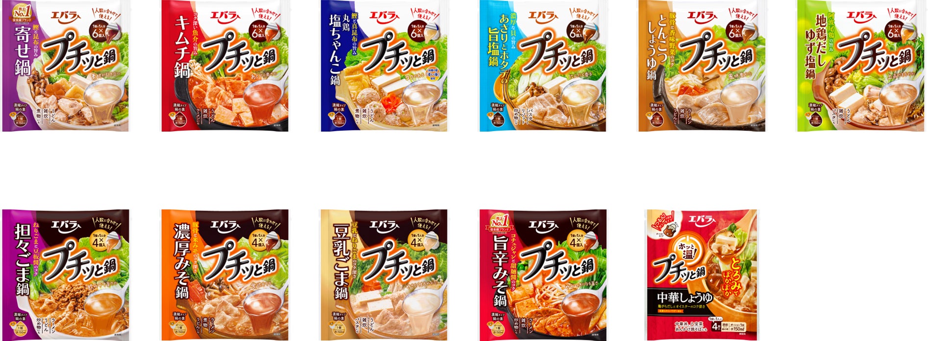 「プチッと鍋」シリーズは、人数や好みに合わせて鍋を楽しむことができる“1個で1人分の鍋の素”です。本シリーズは「寄せ鍋」や「キムチ鍋」など定番の味わいのほか、「プチッと鍋 濃厚みそ鍋」をはじめ、濃厚な味わいを楽しめる商品も揃えております。そのほかにも、2024年8月に発売した新商品「プチッと鍋ホッと温 中華しょうゆ」など、全11種の豊富なラインアップから、バリエーションを選べる楽しさを提供しております。