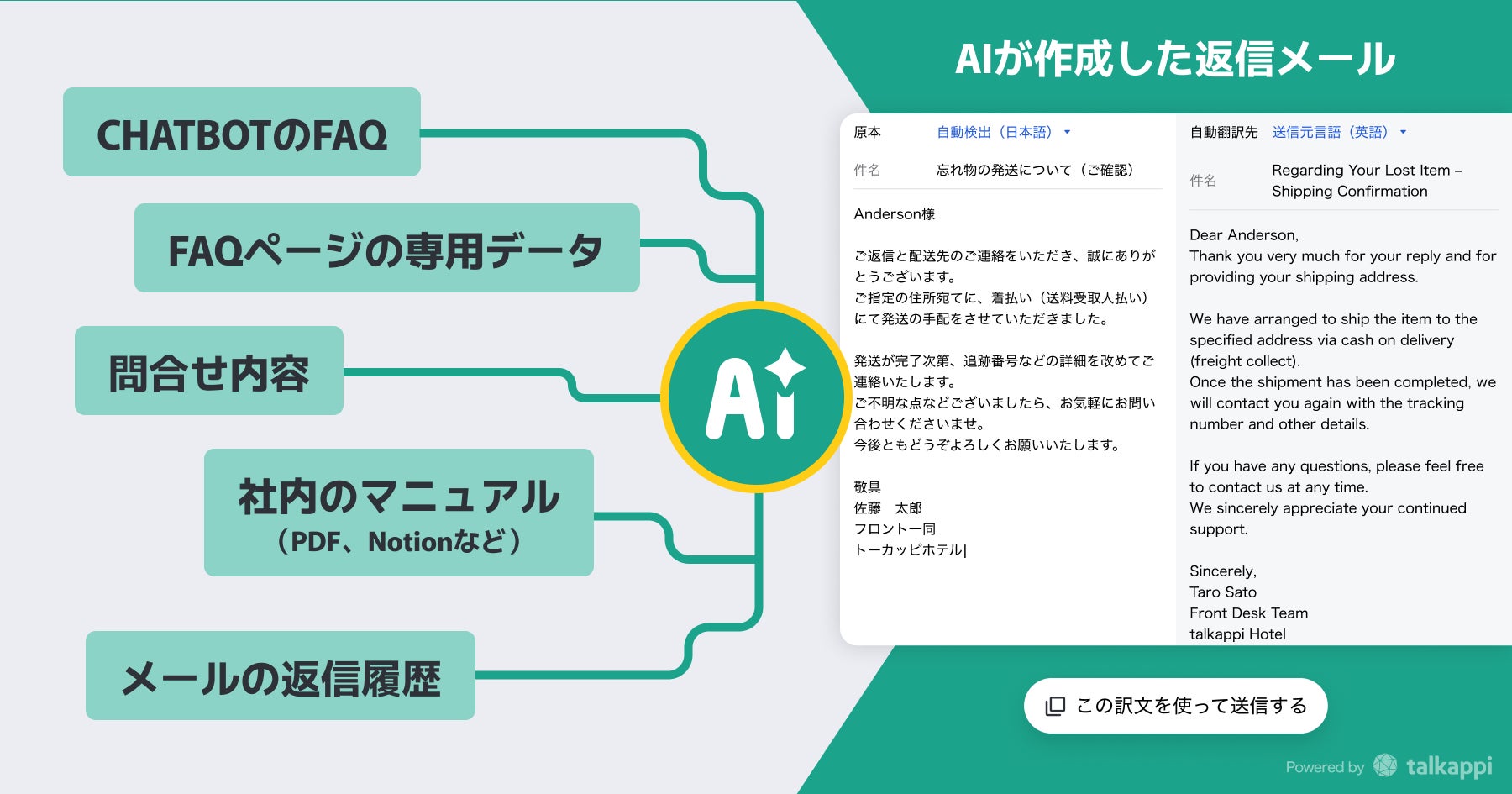 また、talkappi CHATBOTをご導入の施設では、チャットボットに登録されたFAQデータが自動的に参照されます。これにより、過去の対応履歴との一貫性を保ちながら迅速に返信文を作成でき、スタッフの経験差による対応のばらつきを軽減します。新人スタッフやパートスタッフでも、一定の品質で丁寧な対応が可能になります。