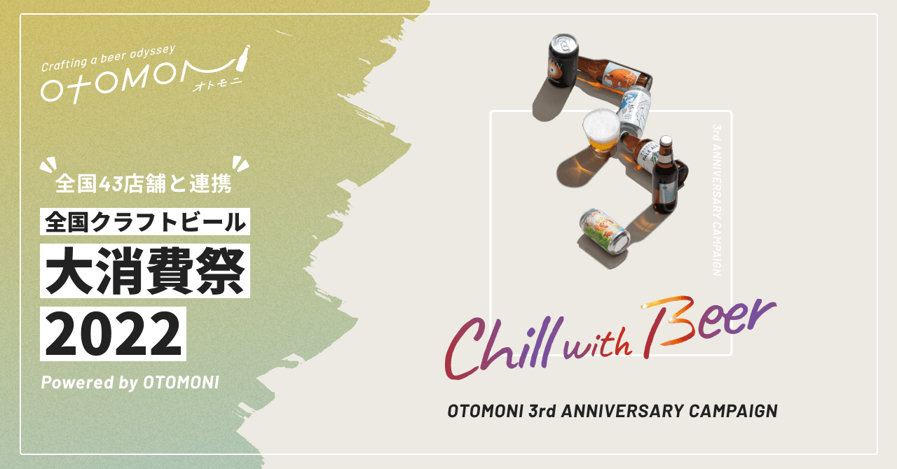 そんな原価高騰の波にさらされているブルワリー様のお力に少しでもなれるよう、日頃の感謝を込めて集客支援をするべく現在オトモニで開催中のサービス開始3周年記念キャンペーン「#ChillWithBeer / 3周年はまったりと、クラフトビールを楽しもう」にて、ブルワリー様の運営しているお店に足を運んでもらうきっかけを作る来店促進キャンペーン「全国クラフトビール大消費祭2022」を開催します。