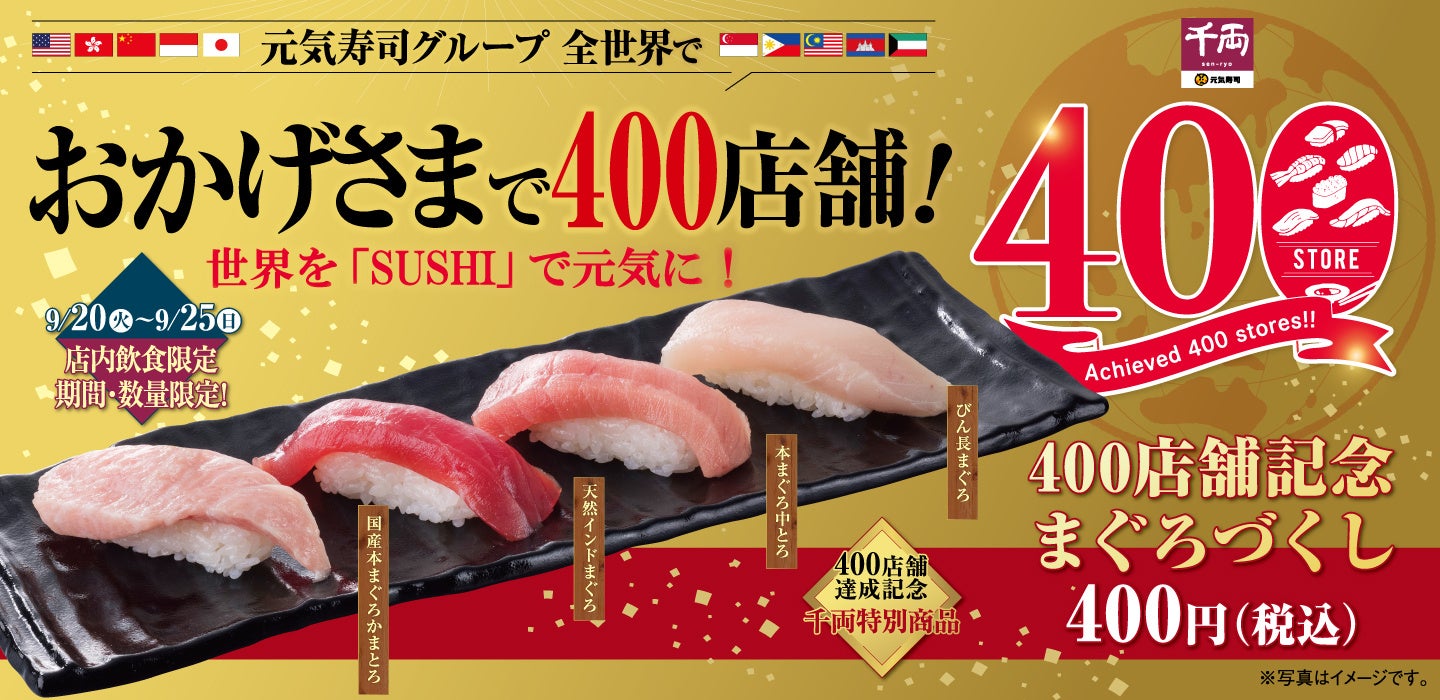 元気寿司・魚べいでは「まぐろづくしセット」を、千両では「400店舗記念まぐろづくし」を、 9月20日(火)より、全世界400店舗達成にちなんで400円(税込)にて、期間・数量限定で販売いたします。