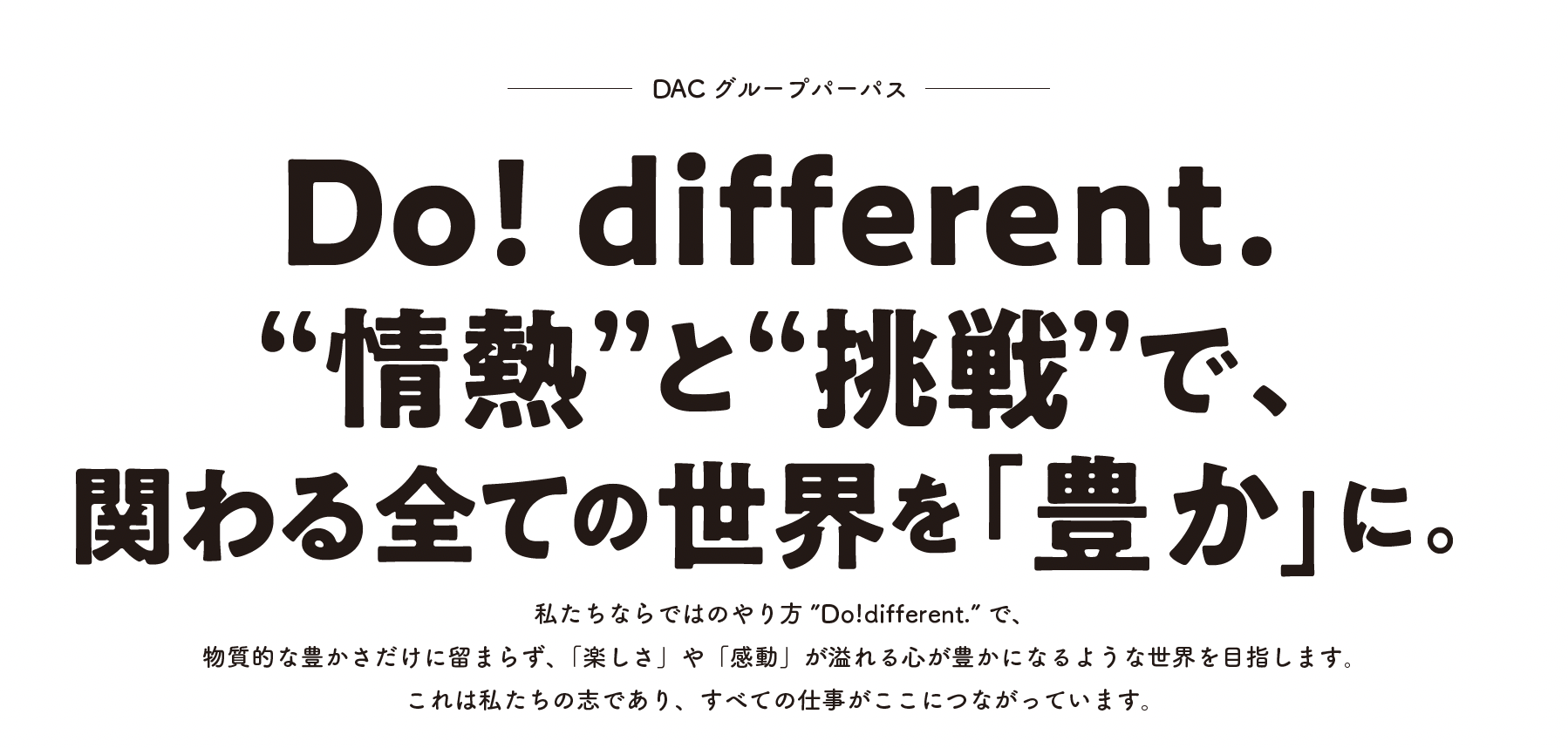 私たちが大事にしてきた行動指針であり、価値基準である「DACイズム」の代表的な考え方「Do! different.」の精神を胸に、物質的な豊かさだけに留まらず、「楽しさ」や「感動」が溢れる心が豊かになるような世界を目指します。 これは私たちの志であり、広告による課題解決から、地方創生、社会貢献活動に至るまで、DACグループのすべての仕事がここにつながっています。