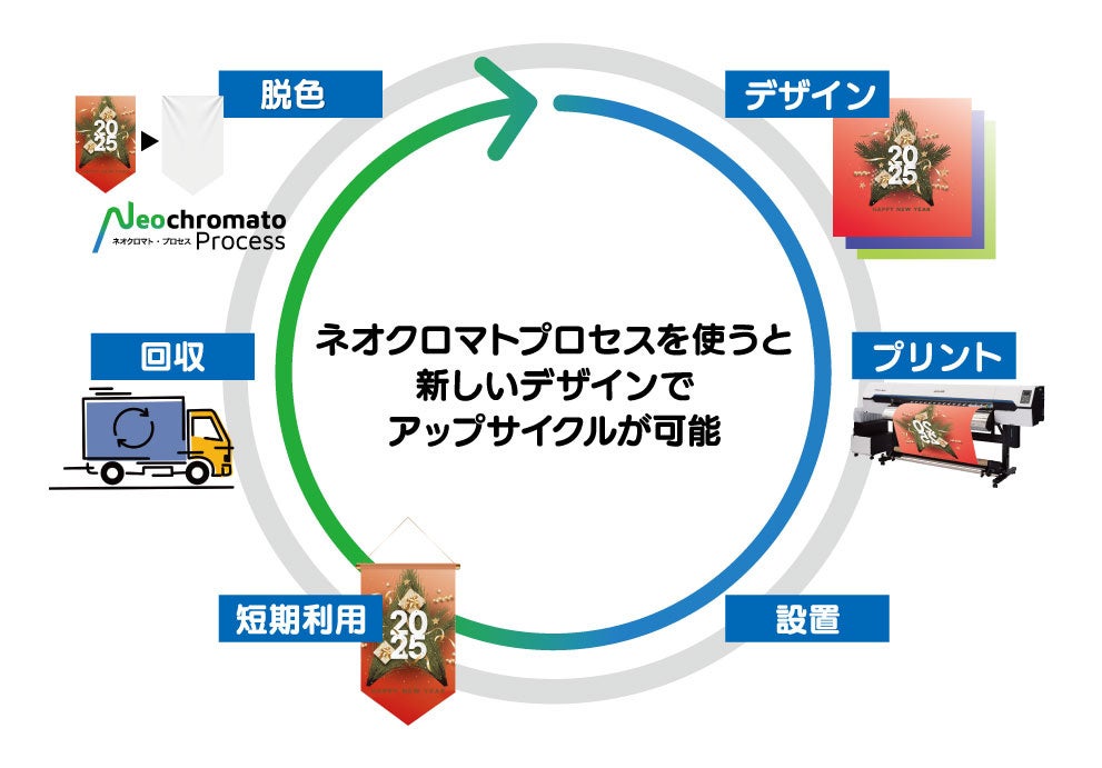 ネオクロマト加工は分散染料プリント・染色されたポリエステル生地に専用の薬剤を塗布し、熱を加えると脱色できる技術です。脱色後は新たに染色・プリントすることが可能(当社は再プリントまでの工程を「ネオクロマトプロセス」と呼称)で、使い捨てされることが多いのぼり旗や衣料品などの再利用に適用できます。