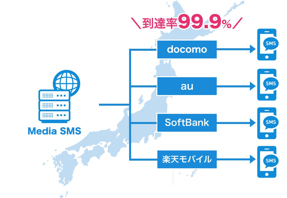 日本の携帯電話事業者(ドコモ、KDDIau、ソフトバンク、楽天モバイル)との直接接続による設計で、「高い着信率」「高いセキュリティ」「豊富な送達結果」を実現しています